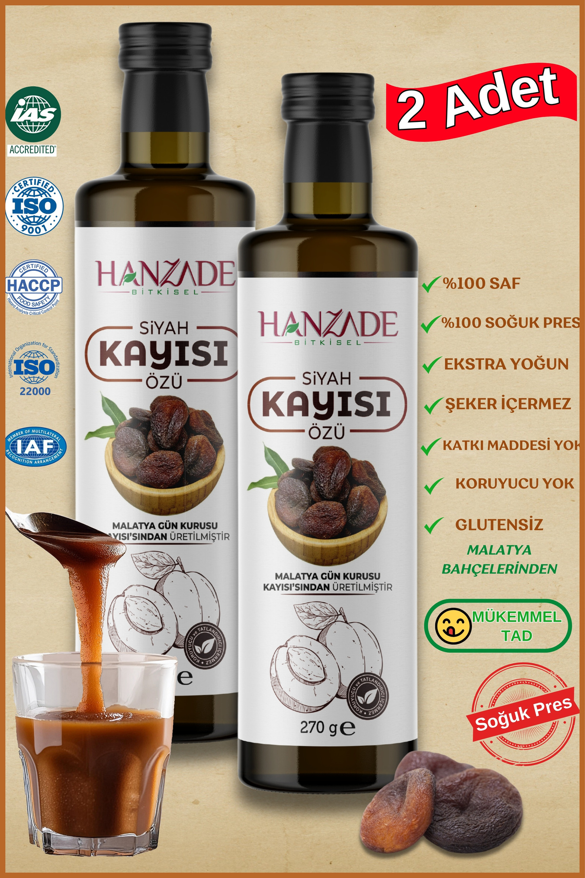 Completely natural and additive-freeEnjoy the flavor and naturalness of Hanzade Herbal Black Apricot Extract!Obtained from the pulp of carefully selected black apricots grown in the fertile soil of Malatya,this product contains no added sugar or glucose.Black Apricot Extract, produced without preservatives or sweeteners,preserves its natural flavor and nutritional value.