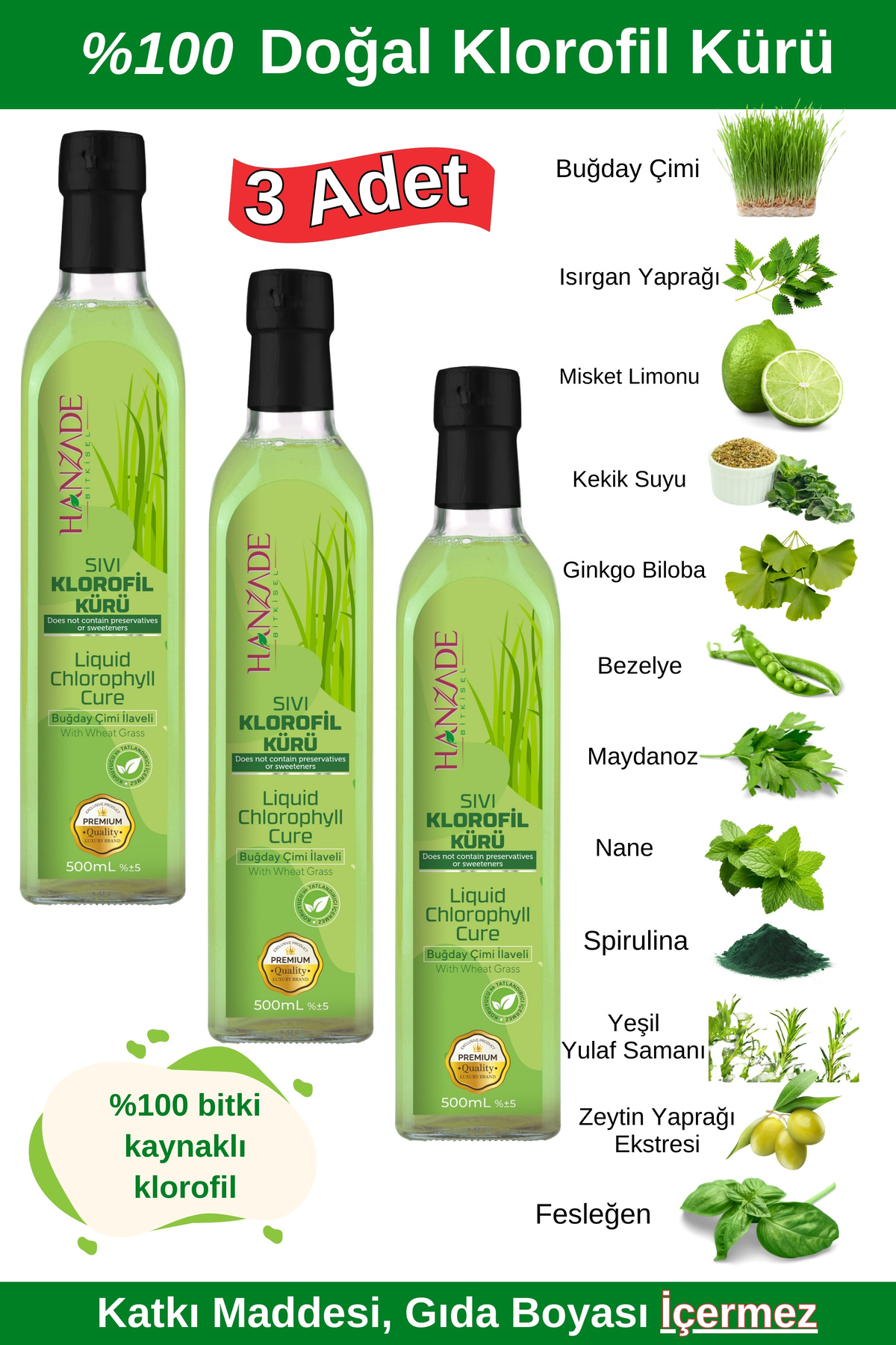 Hanzade Herbal Liquid Chlorophyll Cure Wheat Grass Added Plant Extracts 500 ML x 3 Glass Bottles
