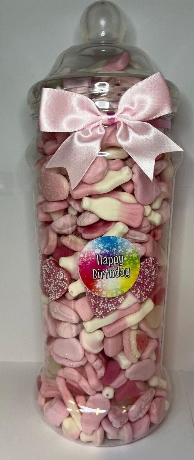Handmade pick n mix style jar of yummy sweets! The victorian style jar includes a wide variety of tasty sweets - all pink in colour Please note the contents of the jar may sometimes vary but will always be a variety of yummy sweets - other designs available These make the perfect gift for a loved one on their birthday Please note: These sweets are assembled in an area that handles WHEAT, GLUTEN, SOYA, MILK, PEANUTS, NUTS other allergens. Not suitable for vegetarians