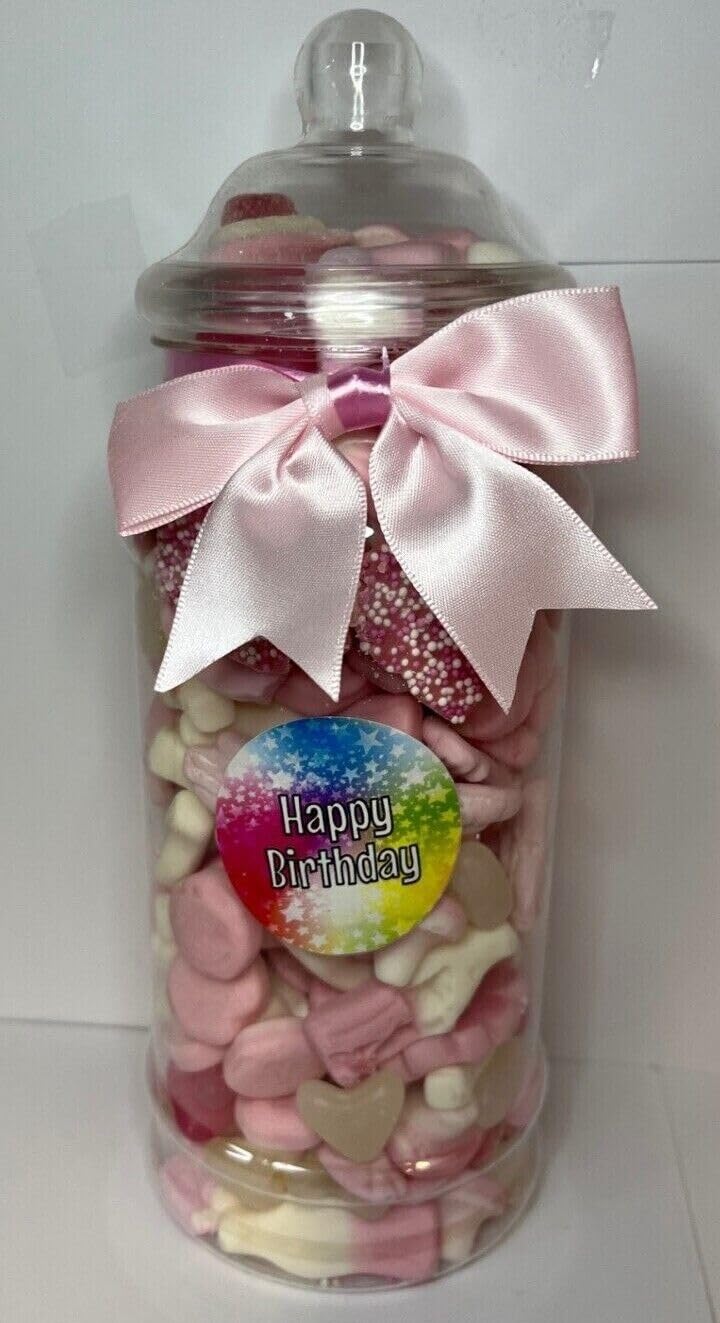 Happy Birthday Filled Pick N Mix Sweet Victorian Jar Gift Personalised Present 970ml Pink