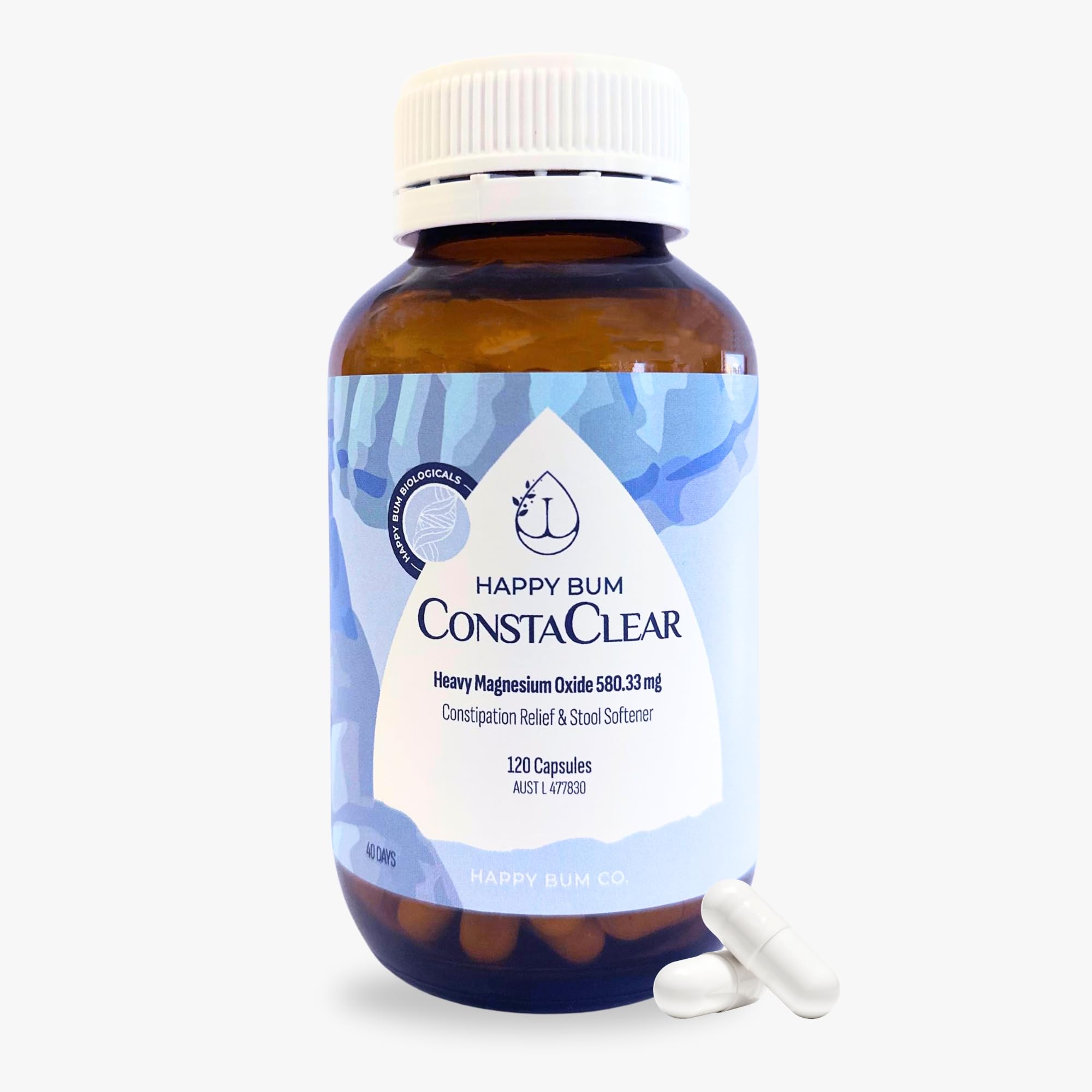Happy Bum CostaClear for Constipation for Women and Men | Gentle Magnesium Constipation Relief & Colon Cleansing Support, Softens Stool, and Eases Bloating | 120 Capsules