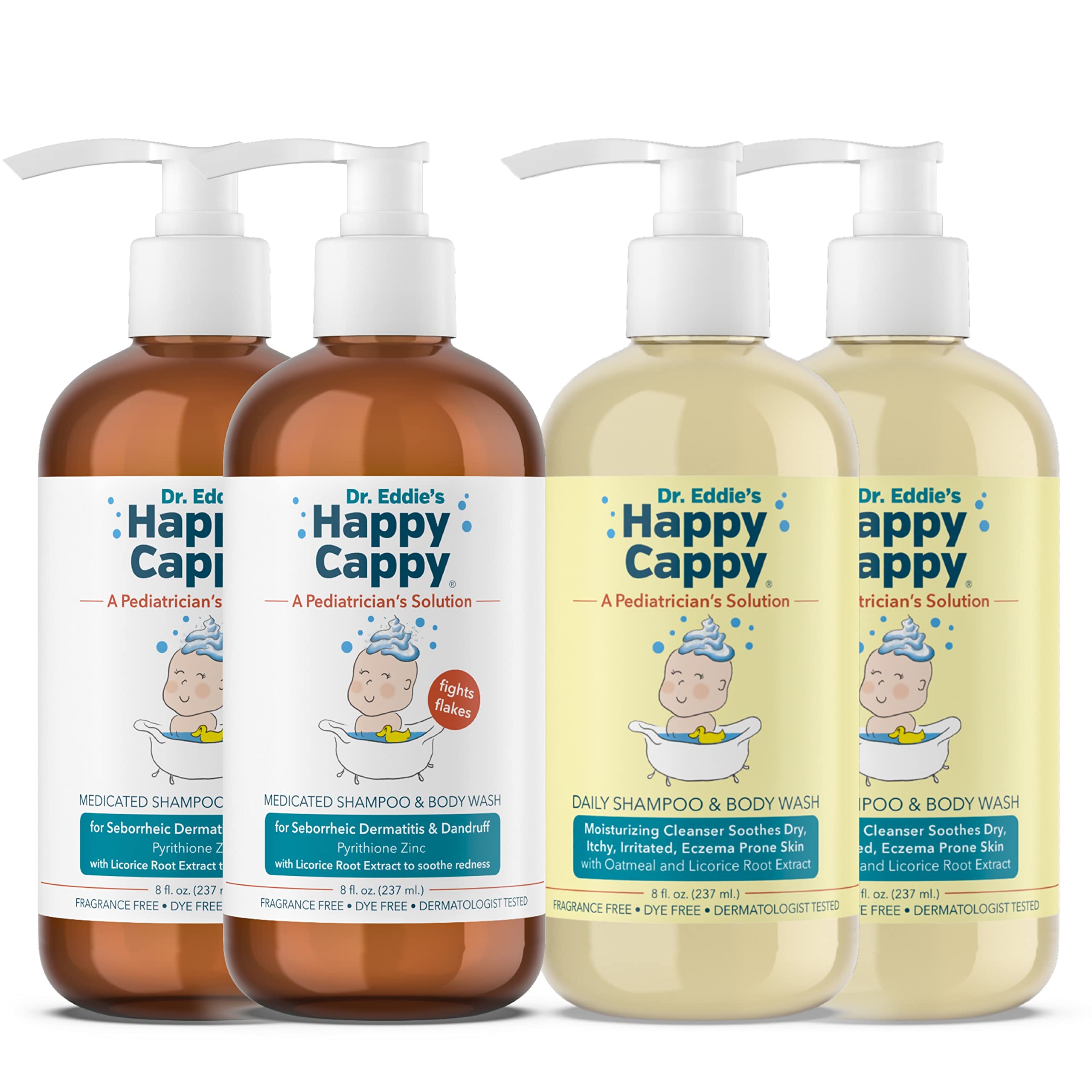RECOMMENDED USE - Stop flakes redness by using medicated shampoo on the hair, face, body to help dandruff seborrheic dermatitis. On days when not using medicated shampoo, use daily shampoo. SOOTHING INGREDIENTS - Our shampoo bundle is infused with natural licorice root extract to soothe redness as well as being fragrance-free, paraben-free, sulfate-free, hypoallergenic. CHILDREN OF ALL AGES - Happy Cappy Medicated Shampoo is the first over-the-counter baby wash made specifically for children of all ages to tackle dandruff and seborrheic dermatitis. FOR SENSITIVE SKIN - Our gentle shampoo is free of skin irritants like fragrance, dye, and parabens. It offers a rich lather with no harsh sulfates - a baby essential for every parent's care routine. DESIGNED BY A PEDIATRICIAN - Dr. Eddie's Happy Cappy Medicated Shampoo was created by a pediatrician to gently help dandruff and seborrheic dermatitis, also known as cradle cap.