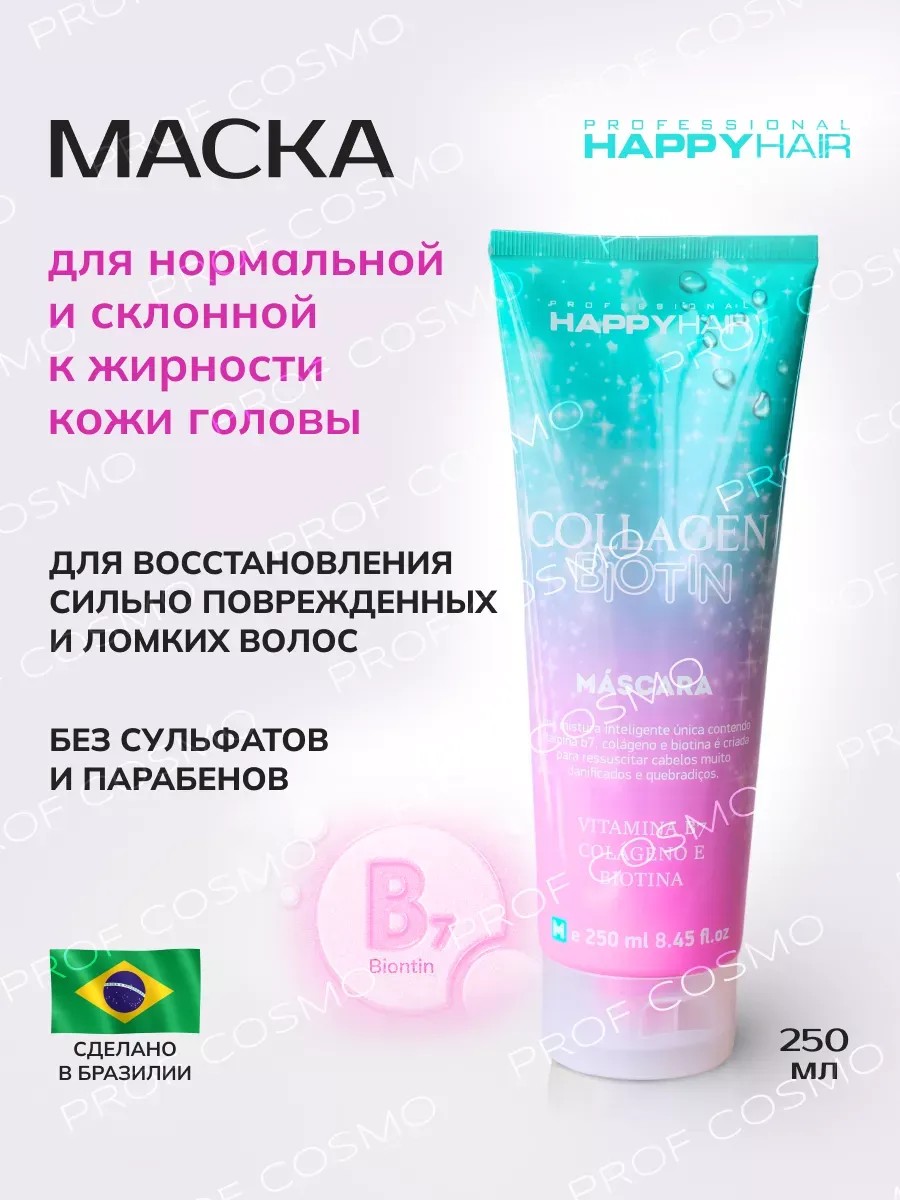 Вы хотите, чтобы ваши волосы выглядели роскошно и удивляли всех окружающих блеском и красотой? Тогда вам нужна профессиональная маска happy hair collagen biotin , ( коллаген и биотин ) Бессульфатная маска содержит витамин B7, коллаген и биотин, они созданы для восстановления сильно поврежденных, ломких, естественных или окрашенных волос. Не содержит сульфатов SLS, SLES и парабенов. Для нормальной и склонной к жирности кожи головы. Mask филер идеально для ухода после процедуры кератинового выпрямления, нанопластики, ламинирования, химических процедур, кератин и ботокса. Нормализует работу волосяных фолликул, восстанавливает естественную первозданную гладкость, уменьшает ломкость и облегчает расчесывание, облагораживая сияющим блеском. Безсульфатная маска косметическая для волос женская, мужская или подростков позволяет достичь эффекта профессиональных салонных процедур в домашних условиях, придает волосам здоровый вид и не утяжеляет их. Эта маска идеально подходит для тех, кто хочет, чтобы их волосы выглядели потрясающе без необходимости тратить кучу денег на дорогие средства и основные салонные процедуры. Уходовая косметика пленка с особым составом восстанавливает структуру локонов, дарит здоровый блеск и красоту, делая их гладкими как шелк, доя роста волос. Силиконовая маска обеспечивает бережную очистку волос, против выпадения для мужчин и женщин. Бразильская маска более эффективная чем Корейская. Производитель косметики для салонов красоты создал sos средство для домашнего ухода, которые подходят для всех типов волос. Технологи постоянно обновляют и улучшают продукцию для ухода за волосами, используют лучшие ингредиенты. Биотин - способствуют укреплению и росту волос, понижают активность сальных желез. Коллаген - препятствует появлению ломкости и выпадению волос.
