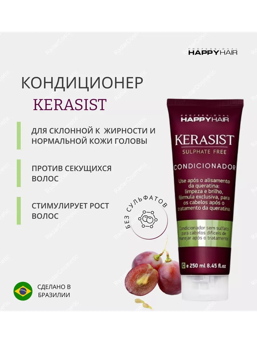 Кондиционер для волос Happy Hair Kerasist- после процедурный кондиционер на экстракте виноградной косточки. Без сульфатов и парабенов. В составе масла виноградной косточки содержатся антиоксиданты, хлорофилл, витамины, протеин, минералы, жирные кислоты- олеиновая, арахиновая и линолевая.