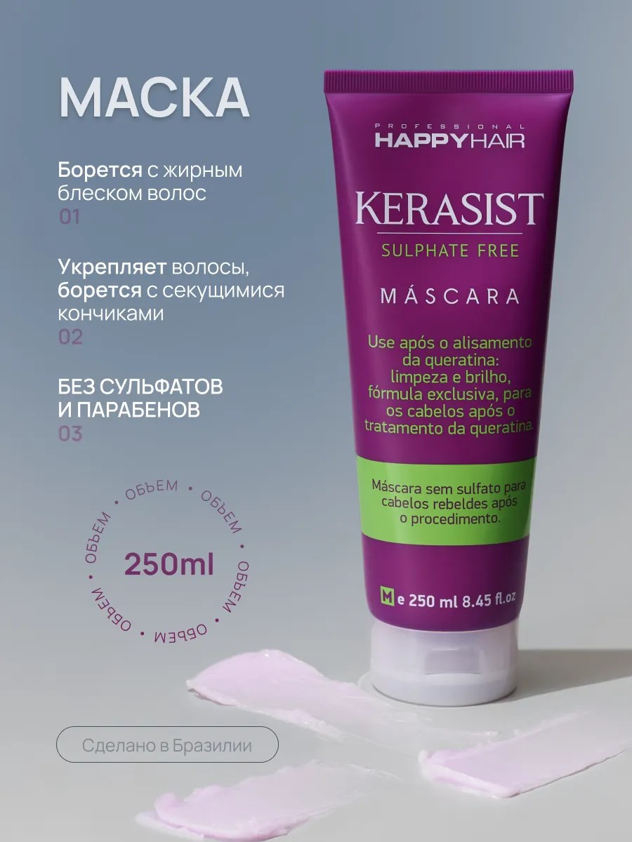 Happy Hair KST Professional Mask (KERASIST). Sulfate-free post-treatment mask with grape seed extract. Grape seed oil contains antioxidants, chlorophyll, vitamins, protein, minerals, and fatty acids (oleic, arachidic, and linoleic). Does not contain sulfates, SLS, SLES, or parabens. Strengthens strands, prevents breakage and hair loss. Fights split ends. Ideal for oily hair. This filler mask is ideal for care after keratin straightening, nanoplasty, lamination, chemical treatments, keratin, and Botox. It normalizes hair follicle function, restores natural, pristine smoothness, reduces breakage, and facilitates combing, leaving hair with a radiant shine. This sulfate-free cosmetic hair mask for women, men, and teenagers allows you to achieve the effects of professional salon treatments at home, leaving your hair looking healthy without weighing it down. This mask is ideal for those who want stunning hair without spending a fortune on expensive products and major salon treatments.