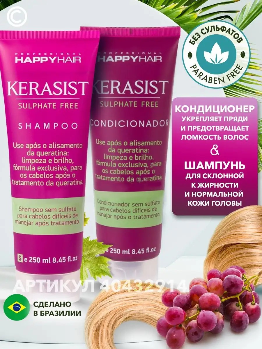 Бессульфатный профессиональный шампунь и кондиционер женский для волос Happy Hair KERASIST – это рецепт здоровых и роскошных волос! Состав набора уходовой косметики основан на экстракте ВИНОГРАДНОЙ КОСТОЧКИ. Он богат Омегой-6, линолевой кислотой, витаминами А, Е, С и группы В, микроэлементами и антиоксидантами. Уход за волосами с данными компонентами борется с проблемами излишней жирности и перхоти. Идеальное сочетание для средства от выпадения и роста волос! Шампунь глубокой очистки содержит ПАНТЕНОЛ, который проникает в структуру волосяного фолликула, питает и увлажняет его изнутри, придавая гибкость, упругость и эластичность, отвечая за восстановление волос. Шампунь для склонной к ЖИРНОЙ и НОРМАЛЬНОЙ кожи головы и волос. ХЛОРОФИЛЛ в составе способен защитить волосы от вредного воздействия свободных радикалов. Шампунь и бальзам ополаскиватель для волос идеально подойдет для подверженных химическим воздействиям, осветленных и мелированных волос. Эксклюзивная формула шампуня и кондиционера разработана для ухода после кератинового выпрямления, нанопластики, ботокса и ламинированиия волос. Косметический набор шампунь и бальзам без сульфатов и парабенов. Happy Hair KST shampoo и mask также предназначен для кудрявых, сухих и поврежденных волос. Используйте средство для укрепления волос в качестве ежедневного ухода и убедитесь в эффективности этой линейки!