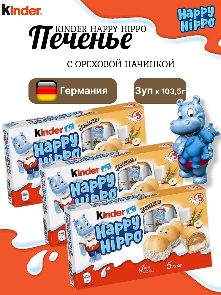 | Комплектация | Печенье Киндер Хеппи Хиппо со вкусом ореха 103,5 гр - 3 шт |