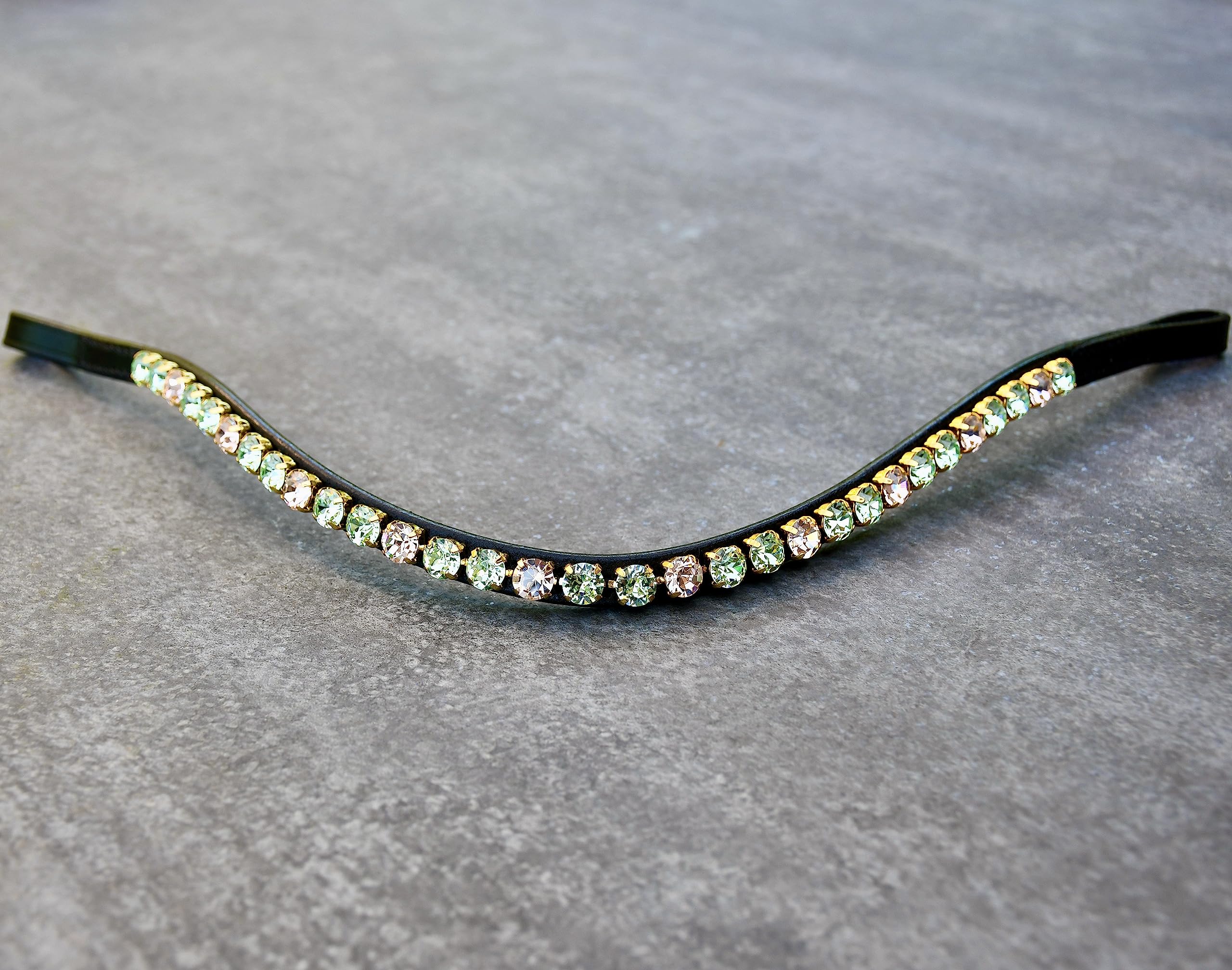 Beautiful bridle strap 'pasture' for your horse with large, individually hand -sewn glitter chats in light green apricot.Our high -quality lucky hinge forehead straps are all made by hand in our family company in Celle.The gold -colored stones are glued and also sewn by hand.The curved, narrow forehead straps for your horse are black and dark brown in the leather colors.Other leather colors on request!Headband Lengths (just measured including loops): Shetty: 35 cm, pony: 38 cm, VB: 40 cm, WB: 42 cm, WB XL: 44 cm, KB: 46 cm The inner size is approx. 3.1 cm.Herring straps for Micklem possible on request.High quality made in Germany!Shetty: 35cm, pony: 38cm, VB: 40cm, WB: 42cm, WB XL: 44cm, KB: 46cm.Made by hand in Germany.For particularly good hold, each stone is sewn glued individually.Real leather in black or dark brown - other colors on request.High quality, large glitter stones in light green apricot.Schöner Trensen Stirnriemen 'Weide' für dein Pferd mit großen, einzeln handvernähten Glitzer Chatons in hellem Grün Aprikot. Unsere hochwertigen GlücksHucke Stirnriemen werden alle von Hand in unserem Familienunternehmen in Celle gefertigt. Die goldfarben eingefassten Steine werden geklebt und zusätzlich von Hand vernäht. Den geschwungenen, schmalen Stirnriemen für dein Pferd gibt es in den Lederfarben Schwarz Dunkelbraun. Andere Lederfarben auf Anfrage! Stirnband Längen (gerade gemessen inkl. Schlaufen): Shetty: 35 cm, Pony: 38 cm, VB: 40 cm, WB: 42 cm, WB XL: 44 cm, KB: 46 cm Das Schlaufeninnenmaß beträgt ca. 3,1 cm. Stirnriemen für Micklem auf Anfrage möglich. Hochwertige Qualität made in Germany!Shetty: 35cm, Pony: 38cm, VB: 40cm, WB: 42cm, WB XL: 44cm, KB: 46cm. Von Hand in Deutschland gefertigt. Für besonders guten Halt ist jeder Stein einzeln vernäht geklebt. Echtes Leder in Schwarz oder Dunkelbraun - andere Farben auf Anfrage. Hochwertige, große Glitzer Steine in hellem Grün Aprikot.GlücksHucke Pferde Stirnriemen geschwungen, schmal in Hellgrün Aprikot 'Weide', große, grüne Glitzer Steine, goldene Einfassung (WB, Lederfarbe Schwarz) WB Lederfarbe Schwarz