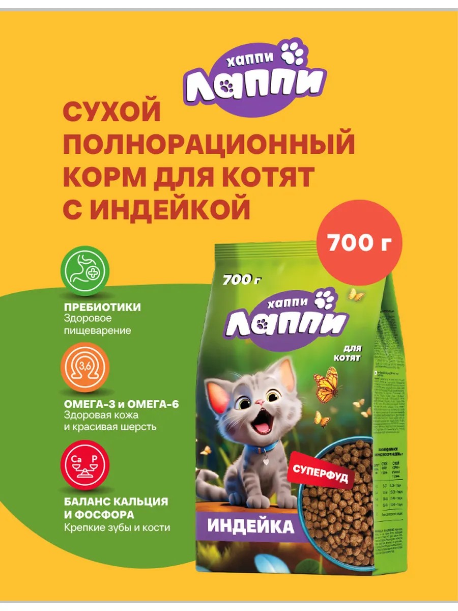| Полное наименование товара | Сухой полнорационный корм для котят с индейкой ТМ Хаппи Лаппи 0,7 кг |