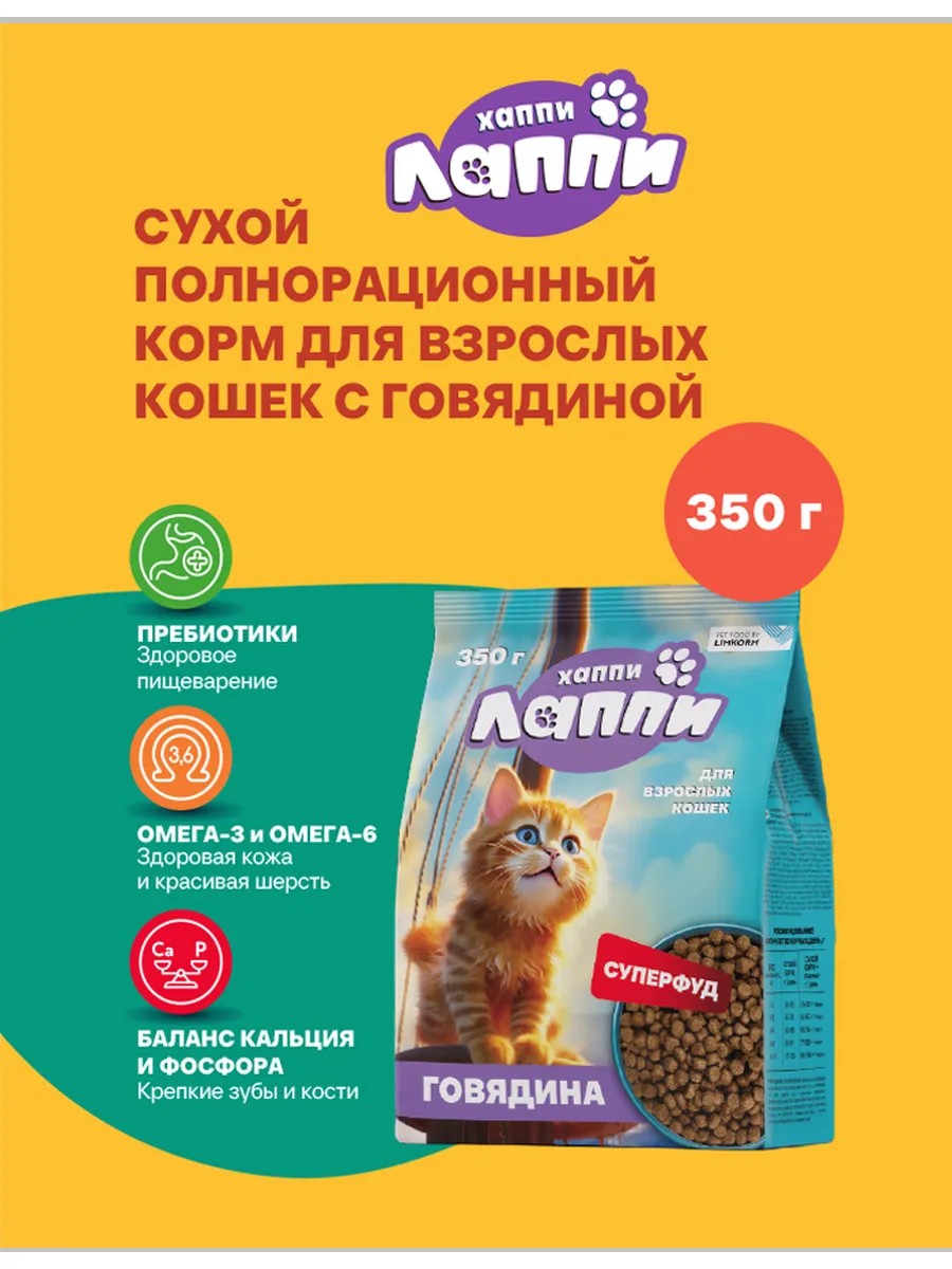 Хаппи Лаппи Сухой корм для кошек, говядина, 0,35 кг