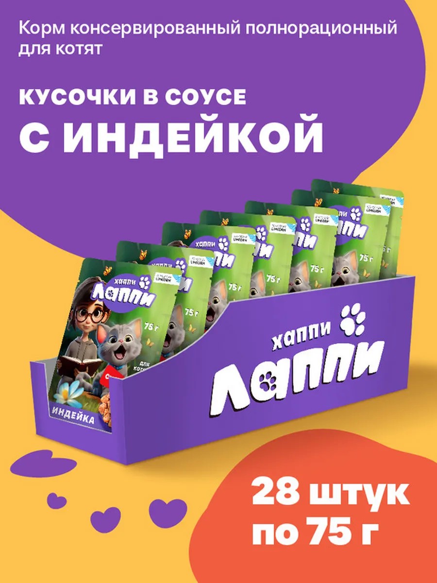 Корм влажный для котят.Кусочки в соусе с индейкой, 75г*28 шт