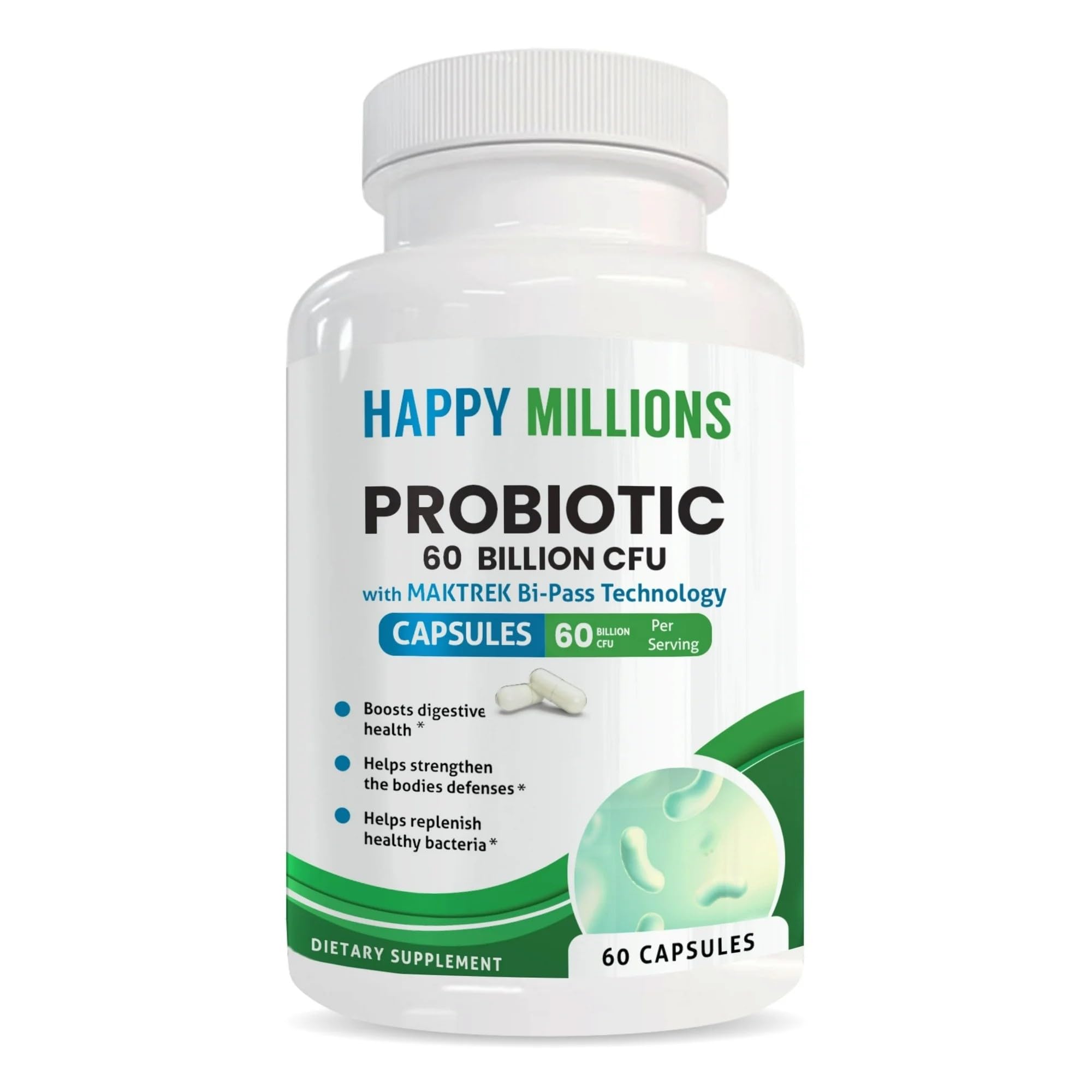 Quality You Can Trust: Made in the USA in a cGMP-compliant facility and third-party tested for purity and potency, HappyMillions Probiotic 60 Billion ensures safety, consistency, and premium quality in every capsule. Daily Wellness Made Simple: Shelf-stable and travel-friendly, these probiotics for men and women require no refrigeration, making them a convenient choice for everyday digestive and immune health. Enhanced Absorption Formula: With marine polysaccharides and prebiotic fructooligosaccharides (FOS), these probiotic capsules ensure superior delivery and survival of live organisms to your gut for maximum effectiveness. Immune Defense Booster: Featuring Lactobacillus Acidophilus, Bifidobacterium Lactis, and other clinically studied strains, this blend nurtures a healthy microbiome, strengthening your body's natural defenses against occasional digestive upsets. Advanced Digestive Support: Packed with 60 Billion CFU and MAKTREK Bi-Pass Technology, our daily probiotic capsules help restore gut flora balance, reduce bloating, and support smooth digestion for both men and women.