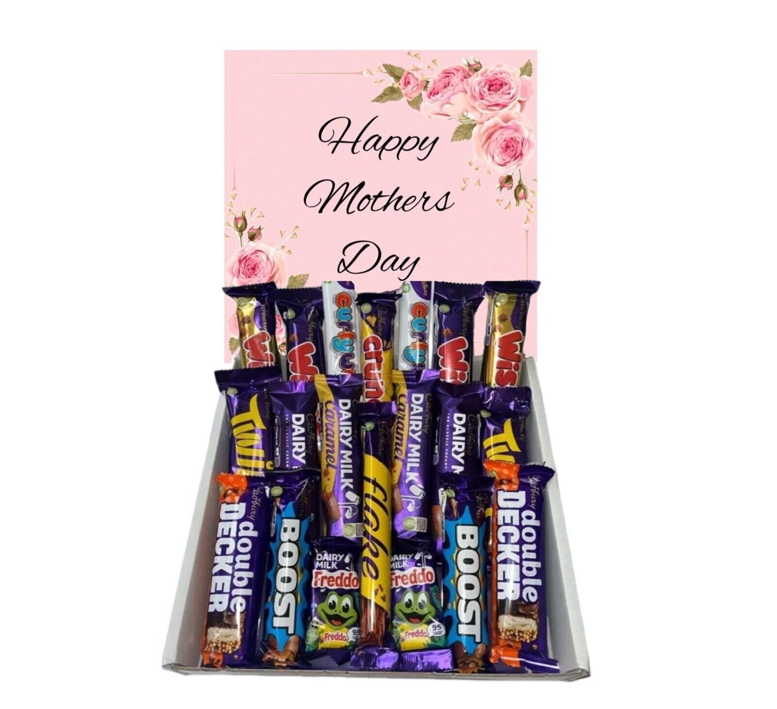 A hamper filled with delicious chocolate full size bars, tied with ribbon and topped with "Happy Mothers Day" This makes the perfect Mothers Day gift but please view our shop for any occasion :- Mothers Day, Fathers Day, Easter, Birthday, Christmas stocking filler, Secret Santa, Passing driving test, Quiz winner, Employee of the month, Well Done, Congratulations, Thank You, Get Well, Thinking Of You, Valentines Day, Movie Night, New Parents, Leaving Gift, New Job, A yummy treat for yourself or just to show your appreciation to your loved ones! A gift that can be sent directly to the chocolate loving recipient! The chocolates in this hamper are all FULL SIZE bars - no multipack sized bars! The gift box includes: Wispa x 2, Wispa gold x 2, Curly Wurly x 2, Freddo x 2, Crunchie x 1, Twirl x 2, Dairy milk x 2, Dairy Milk Caramel x 2, Boost x 2, Double Decker x 2 & Flake x 1 (chocolate may slightly vary at times) These are handmade fresh to order INGREDIENTS Glucose, Sugar, Syrup
