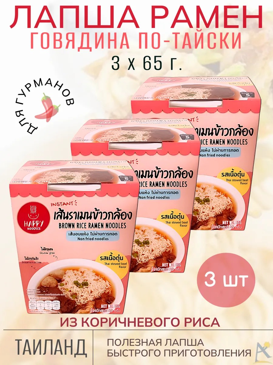 Happy Noodles Thai Beef Ramen Instant Noodles in a 65-gram cup. The set includes 3 cups, 65 g each.