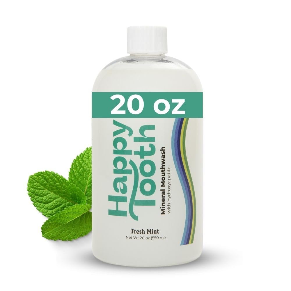 EASY TO USE FOR DAILY ORAL HEALTH SUPPORT: Using Happy Tooth mouthwash is simple. Swish a capful around your mouth for 30–60 seconds after brushing and flossing, then spit - no rinsing required. For best results, use twice daily, morning and night, as part of your oral hygiene routine. Its non-burning formula is safe to swallow in small amounts and ideal for those with sensitive gums or dry mouth. Keep it in your bathroom, gym bag, or travel kit for fresh breath anytime. REAL BENEFITS YOU CAN FEEL AND SEE: Happy Tooth mouthwash does more than mask bad breath. It helps rebuild enamel, fight cavities, and soothe irritation with every rinse. You breath will stay fresher longer, and sensitivity noticeably decreases within weeks. Whether you're managing dry mouth, enamel erosion, or just want a cleaner clean, Happy Tooth delivers results that last. FORMULATED BY A DENTIST FOR TOTAL MOUTH BALANCE: This mouthwash was carefully developed by a dentist with a holistic approach to oral wellness. Unlike conventional formulas focused only on surface-level freshness, Happy Tooth was designed to help remineralize enamel, support gum health, and nourish the oral microbiome. It's a research-backed formula that reflects years of clinical insight and is trusted by health-conscious professionals and families alike. WHAT IT IS AND WHY IT MATTERS: Happy Tooth mouthwash is a fluoride-free, alcohol-free remineralizing rinse powered by hydroxyapatite - the mineral your enamel is naturally made of. It's designed to restore enamel strength, freshen breath, reduce sensitivity, and promote a healthy oral microbiome. Unlike typical harsh mouthwashes, this clean-label formula supports long-term oral health without disrupting your body's natural protective systems. POWERED BY NATURAL INGREDIENTS FOR CLEAN, SAFE ORAL CARE: Happy Tooth mouthwash is made with natural ingredients like hydroxyapatite, peppermint oil and xylitol. Free from fluoride, alcohol, synthetic dyes, and artificial sweeteners, every rinse supports your mouth's natural defenses without disrupting its balance. It's a gentle yet effective formula crafted for the entire family's peace of mind.