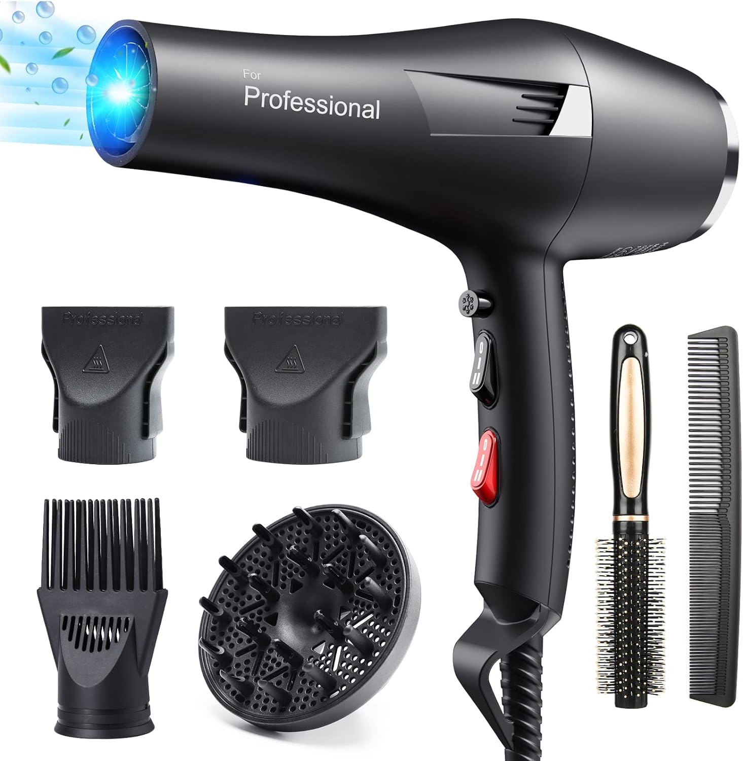 Package contains1 x professional ion hair dryer, 2 x air nozzles, 1 x diffuser, 1 x wind chamber, 1 x curly ram, 1 x comb.1 diffuser and 3 styling nozzlesThe formation of natural and strongly structured curls, the nozzles can blow smooth and flexible hair, different stylings can be used to achieve perfect results and optimally maintain your hair.Ion care technologyThe calion hair dryer uses a high-quality ion technology that talks Frizz.At the push of a button, millions of active ions enclose any strand of hair for perfect styling results and maximum protection and prevent static electricity.Powerful 2400W AC motorThe higher the power, the more the lithium-ion hair dryer can dry the hair from the inside out, the less time it will not damage the protein or the natural moisture of the hair.Ideal for trips and families.2.5 meter long power cord, comfortable space for use.3 heating levels and 2 separate fan stagesProfessional lithium-ion hair dryer with 2 speeds and 3 heating levels for optimal control, even heat distribution prevents heat loss and drying out, faster drying at a healthier temperature for hair care.The cold-wind function with a button can perfectly fix the hairstyle.Paket enthält1 x professioneller Ionen-Haartrockner, 2 x Luftdüsen, 1 x Diffusor, 1 x Windkammer, 1 x Lockenkamm, 1 x Kamm. 1 Diffusor und 3 Styling-DüsenDie Bildung von natürlichen und stark strukturierten Locken, die gerade Düsen können glattes und flexibles Haar blasen, verschiedene Stylings können verwendet werden, um perfekte Ergebnisse zu erzielen und Ihr Haar optimal zu pflegen. Ionenpflege-TechnologieDer Kaltionen-Haartrockner verwendet eine hochwertige Ionen-Technologie, die Frizz bändigt. Auf Knopfdruck umschließen Millionen von aktiven Ionen jede Haarsträhne für perfekte Styling-Ergebnisse und maximalen Schutz und verhindern statische Elektrizität. Leistungsstarker 2400W AC MotorJe höher die Leistung ist, desto mehr kann der Lithium-Ionen-Haartrockner das Haar von innen nach außen trocknen, desto weniger Zeit wird es das Protein oder die natürliche Feuchtigkeit des Haares nicht beschädigen. Ideal für Reisen und Familien. 2,5 Meter langes Netzkabel, bequemer Platz für den Einsatz. 3 Heizstufen und 2 separate LüfterstufenProfessioneller Lithium-Ionen-Haartrockner mit 2 Geschwindigkeiten und 3 Heizstufen für optimale Kontrolle, gleichmäßige Wärmeverteilung verhindert Wärmeverlust und Austrocknen, schnellere Trocknung bei gesünderer Temperatur zur Haarpflege. Die Kalt-Wind-Funktion mit einem Knopf kann die Frisur perfekt fixieren.HappyGoo Professioneller Ionen-Haartrockner 2400 W Phone mit 1 Diffusor, 4 Styling-Düsen, 2,5 m langes Stromkabel, starkes Phon für die Familie, Haarsalon, Frisuren, schwarz