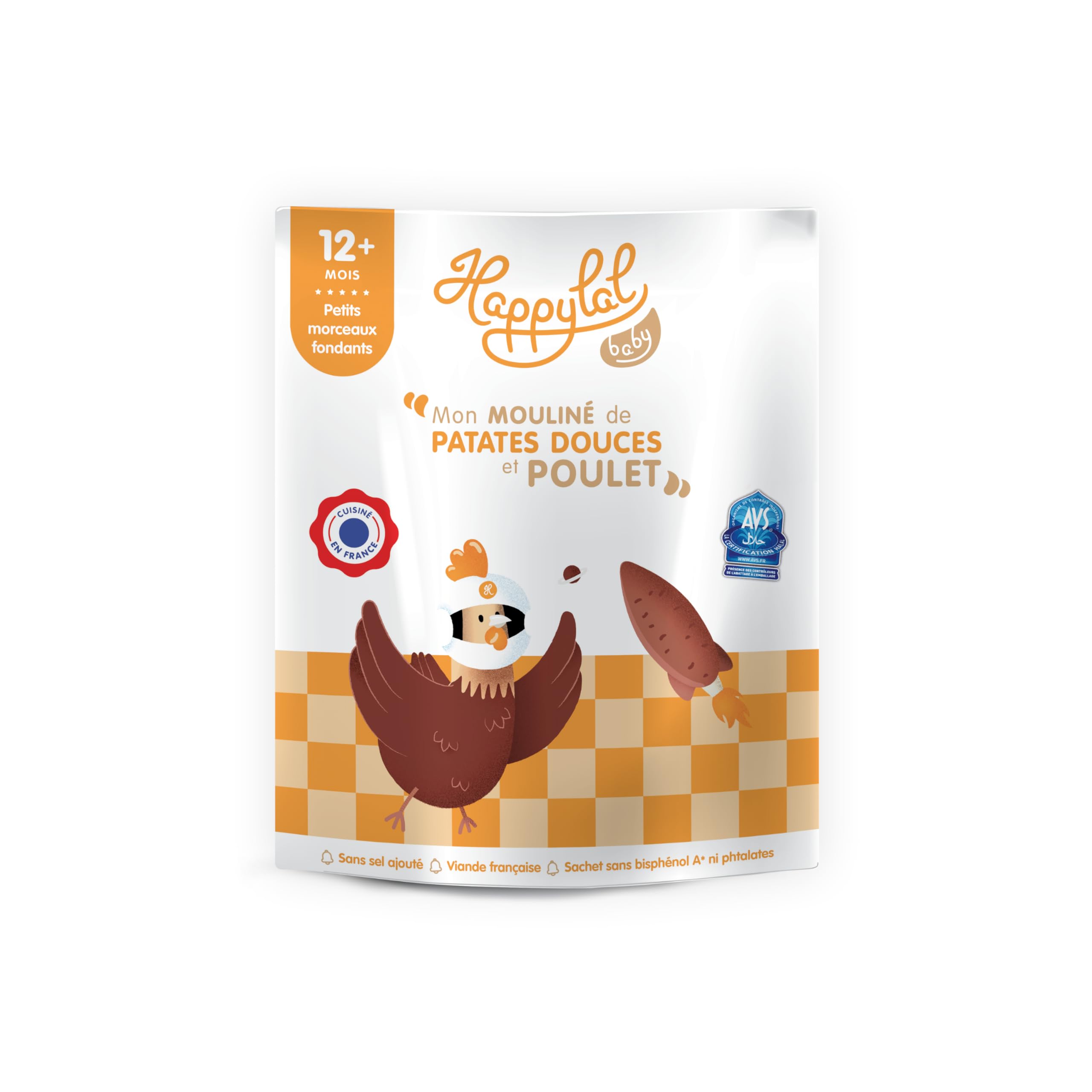 Satisfaction: At HAPPYLAL BABY, a pioneering brand founded by a mom who's an expert in small meals (and cuddles), we're sure our meals will make baby's taste buds dance! Ideas for making it even better (we doubt it, but you never know)? Let us know. Instructions: Knead the bag (it's important!). Depending on how impatient your baby is, heat it for 1 minute in a bain-marie or 30 seconds in the microwave on medium power. Mix well, check the temperature (to avoid dramas!) and serve with love. Made in France: Cocorico! Our recipes are made with healthy foods and are carefully prepared in France, without preservatives, colorings or starch. French quality to delight baby while simplifying parents' daily lives. AVS, Halal certification guarantee: The halal certification of our meals is the foundation of HAPPYLAL BABY. We offer our customers quality products that strictly adhere to the principles and rules of halal consumption. For babies from 12 months: My Sweet Potato and Chicken Puree is a small halal dish intended for little hearts from 12 months. This delicious meal, full of flavor, is ideal for weaning your baby.Satisfaction : Chez HAPPYLAL BABY, marque pionnière fondée par une maman experte en petits plats (et en câlins), on est sûrs que nos repas feront danser les papilles de bébé ! Des idées pour encore mieux faire (on doute, mais sait-on jamais) ? dis-le nous. Mode d'emploi : Malaxe le sachet (c'est important !). Selon le degré d'impatience de bébé, réchauffe-le 1 min au bain-marie ou 30 sec au micro-ondes à puissance moyenne. Mélange bien, vérifie la température (on évite les drames !) et sers avec amour. Fabrication française : Cocorico ! Nos recettes à base d'aliments sains sont préparées avec soin en France, sans conservateurs, colorants ni amidon. De la qualité française pour régaler bébé tout en simplifiant le quotidien des parents. AVS, garantie de certification halal : La certification halal de nos repas est le fondement de HAPPYLAL BABY. Nous proposons à nos clients des produits de qualité, respectant strictement les principes et règles de consommation halal. Pour bébé dès 12 mois : Mon Mouliné de Patates Douces et Poulet est un petit plat halal destiné aux petits cœurs dès 12 mois. Ce délicieux repas, plein de saveurs, est idéal pour la diversification alimentaire de bébé.