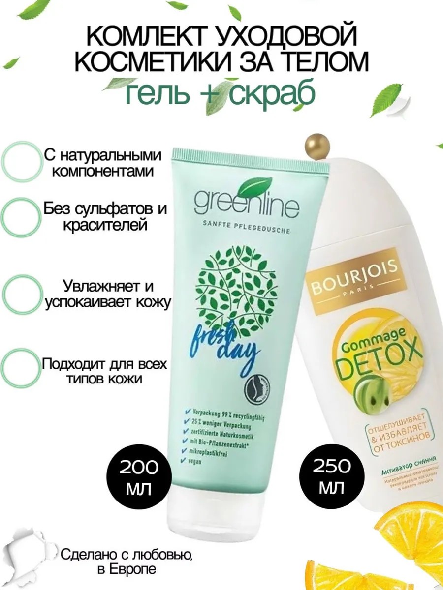 | Комплектация | Скраб гель Bourjois для тела 250 мл; Гель для тела Greenline 200 мл |