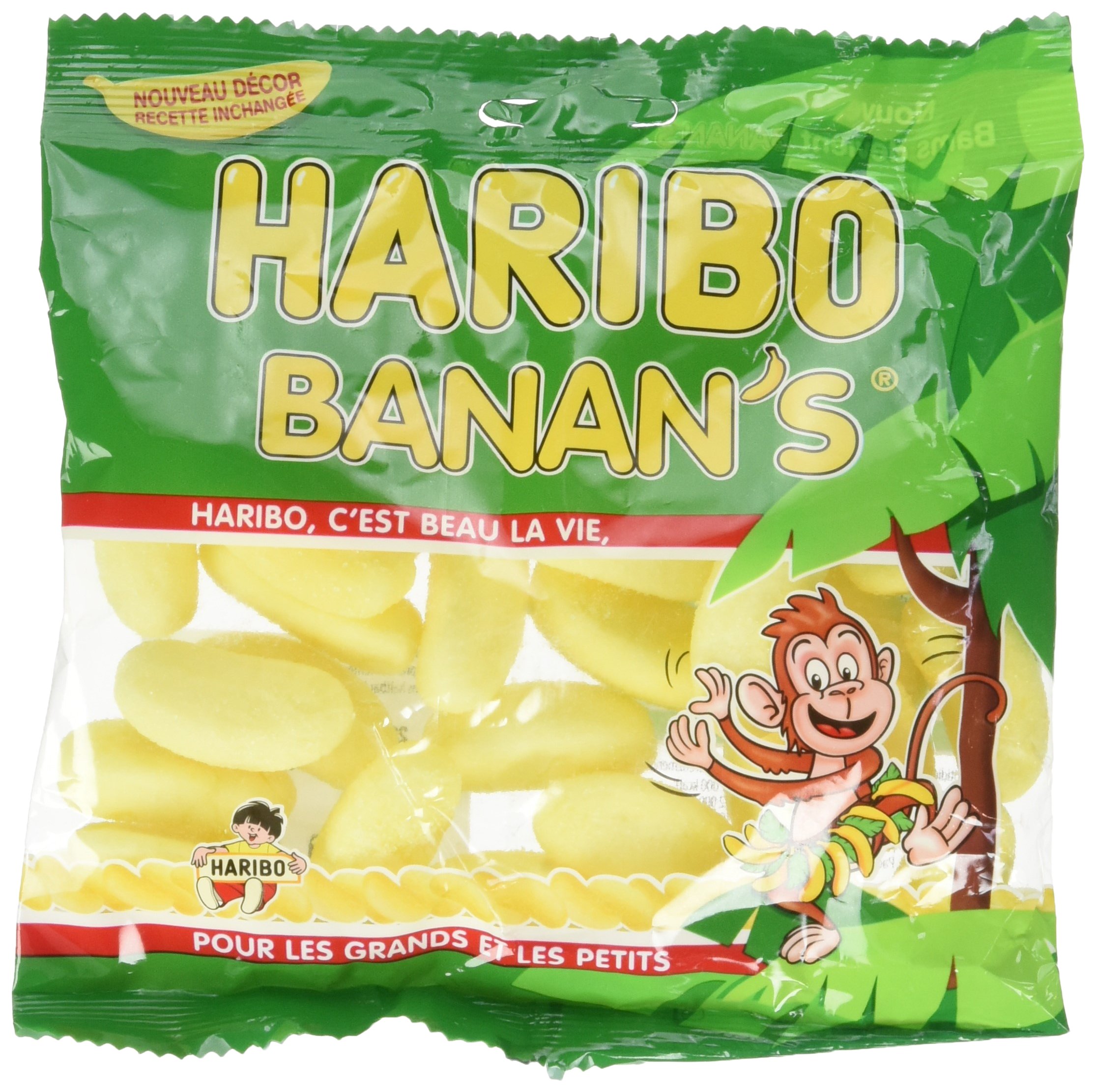 Bag of Haribo banana-shaped aerated sweets. Bag containing 120g of inimitable sweet treats. INGREDIENTS Ingredients: sugar glucose syrup gelatin acidifier: citric acid flavoring fruit and plant concentrates: lemon, safflower invert sugar syrup DIRECTIONS FOR USE Can be consumed at any time of the day. SAFETY WARNING Not suitable for children under 3 years Not suitable for children under 3 years old. 120g plastic bag. Haribo sweets. sachet de bonbons Haribo aérés en forme de bananes. Sachet contenant 120g de douceurs sucrés inimitable. INGRÉDIENTS Ingrédients: sucre sirop de glucose gélatine acidifiant: acide citrique arôme concentrés de fruits et de plantes: citron, carthame sirop de sucre inverti MODE D'EMPLOI peut se consommer à tout moment de la journée. AVERTISSEMENT DE SÛRETÉ Ne convient pas aux enfants de moins de 3 ans Ne convient pas aux enfants de moins de 3 ans. Sachet plastique de 120g. Bonbons Haribo.