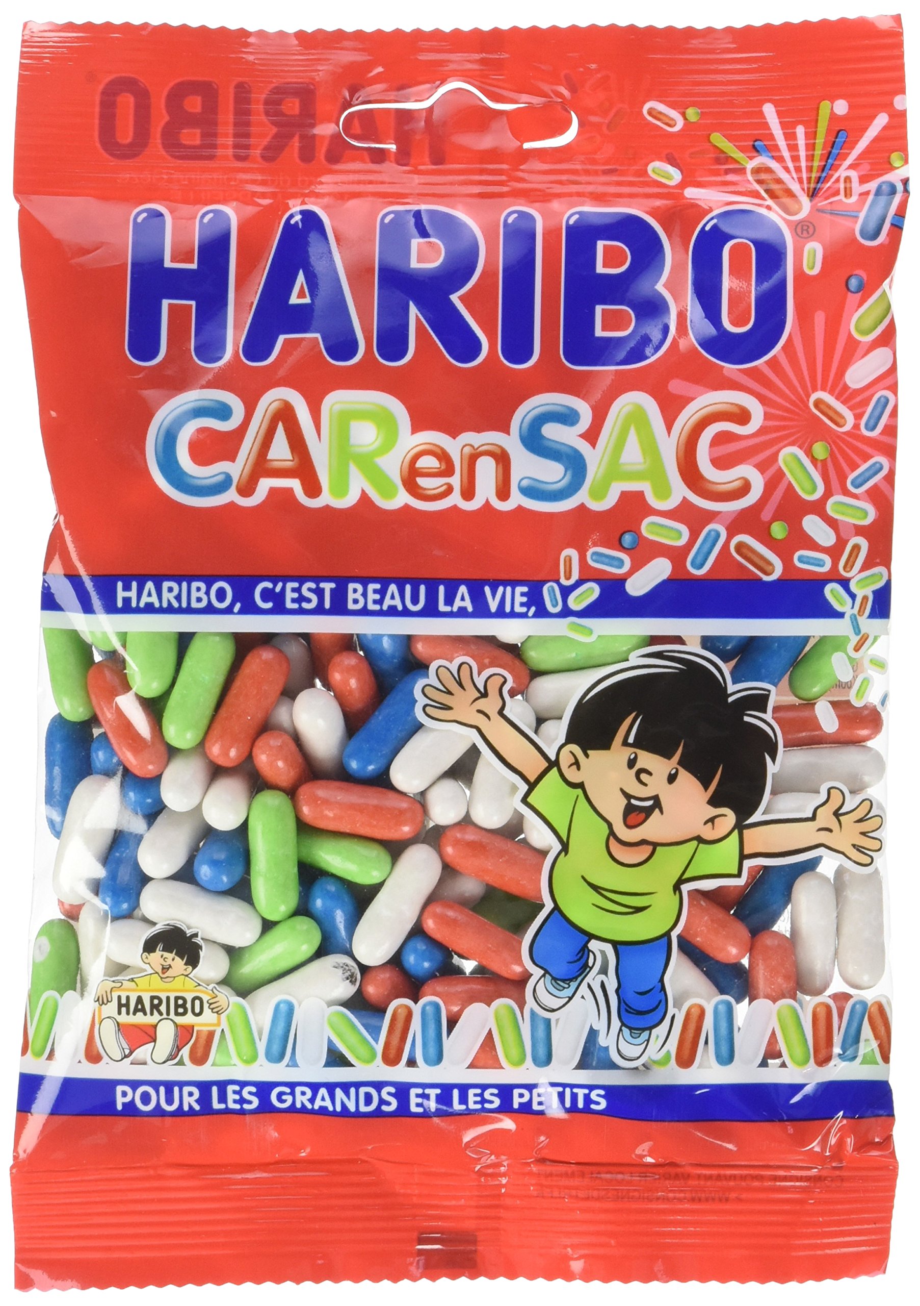 Haribo Soft and licorice-flavored candy bag. Bag containing 120g of inimitable sweet treats. INGREDIENTS Ingredients: sugar treacle syrup wheat flour starch licorice extract maltodextrin flavoring colors: curcumin, carmines, patent blue V, vegetable carotenes salt emulsifier: mono- and diglycerides of fatty acids acidity regulator: sodium bicarbonate glazing agents: white and yellow beeswax, carnauba wax. DIRECTIONS FOR USE Can be consumed at any time of the day. SAFETY WARNING Not suitable for children under 3 years Not suitable for children under 3 years old. 120g plastic bag. Haribo sweets. sachet de bonbons Haribo Tendres et au goût de réglisse. Sachet contenant 120g de douceurs sucrés inimitable. INGRÉDIENTS Ingrédients: sucre sirop de sucre mélassé farine de blé amidon extrait de réglisse maltodextrine arôme colorants: curcumine, carmins, bleu patenté V, carotènes végétaux sel émulsifiant: mono- et diglycérides d'acides gras correcteur d'acidité: carbonate acide de sodium agents d'enrobage: cire d'abeille blanche et jaune, cire de carnauba. MODE D'EMPLOI peut se consommer à tout moment de la journée. AVERTISSEMENT DE SÛRETÉ Ne convient pas aux enfants de moins de 3 ans Ne convient pas aux enfants de moins de 3 ans. Sachet plastique de 120g. Bonbons Haribo.