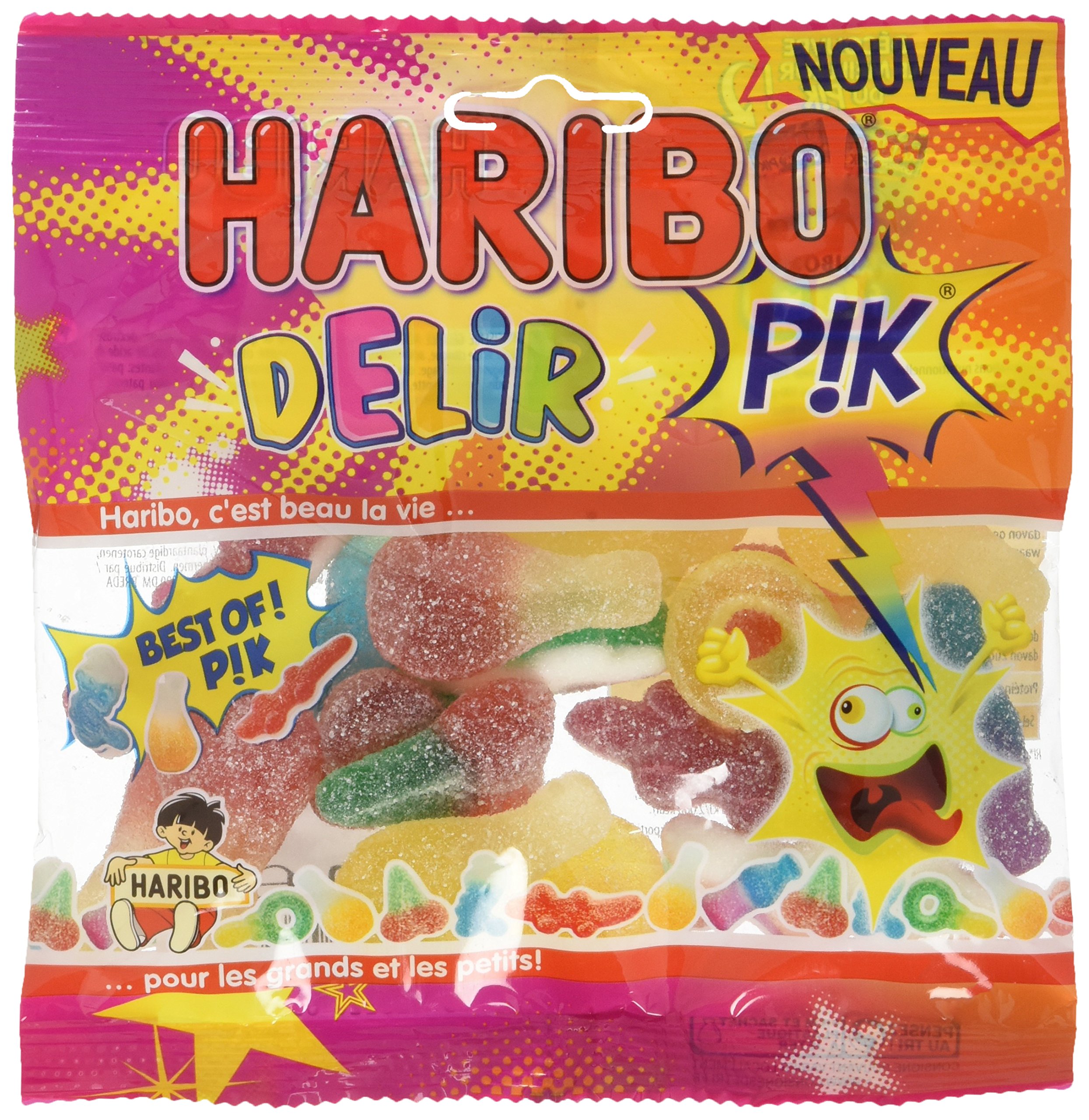 Bag of sweets consisting of: Smurfs Pik, Frite Pik, Cola Pik, Croco Pik and Denture Pik. Bag containing 120g of inimitable sweet treats. INGREDIENTS Ingredients: glucose syrup sugar gelatin dextrose acidifiers: citric acid, malic acid glazing agent: carnauba wax acidity regulators: tricalcium citrate, sodium acid malate flavoring fruit and plant concentrates: lemon, safflower invert sugar syrup colors: carmines, patent blue V, plant carotenes, lutein, anthocyanins. DIRECTIONS FOR USE Can be consumed at any time of the day. SAFETY WARNING Not suitable for children under 3 years Not suitable for children under 3 years old. 120g plastic bag. Haribo sweets. sachet de bonbons composé de: Schtroumpfs Pik, Frite Pik, Cola Pik, Croco Pik et Dentier Pik. Sachet contenant 120g de douceurs sucrés inimitable. INGRÉDIENTS Ingrédients: sirop de glucose sucre gélatine dextrose acidifiants: acide citrique, acide malique agent d'enrobage: cire de carnauba correcteurs d'acidité: citrate tricalcique, malate acide de sodium arôme concentrés de fruits et de plantes: citron, carthame sirop de sucre inverti colorants: carmins, bleu patenté V, carotènes végétaux, lutéine, anthocyanes. MODE D'EMPLOI peut se consommer à tout moment de la journée. AVERTISSEMENT DE SÛRETÉ Ne convient pas aux enfants de moins de 3 ans Ne convient pas aux enfants de moins de 3 ans. Sachet plastique de 120g. Bonbons Haribo.