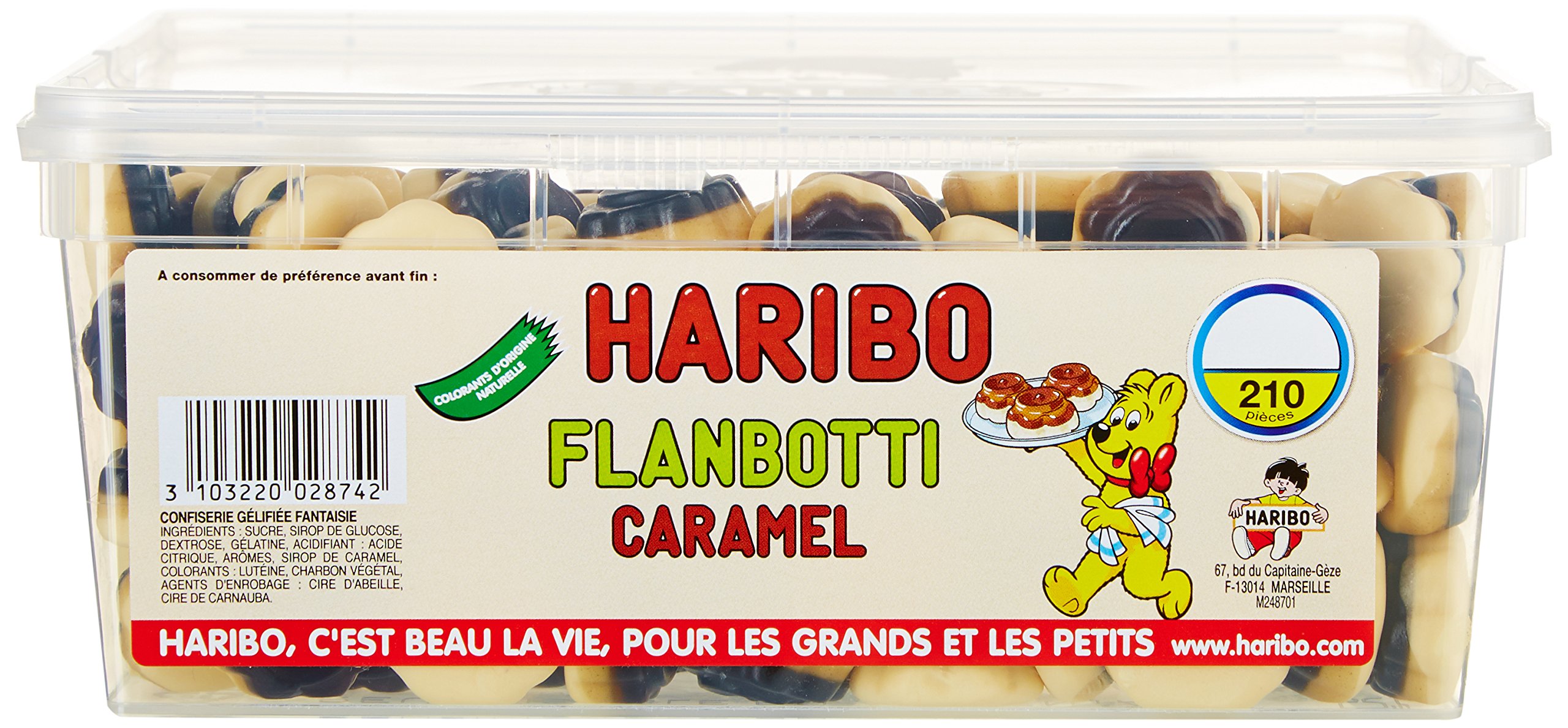 Haribo is a family business founded in Germany in 1920 by Hans Riegel. Since its success with the "Golden Bears", this brand has been delighting adults and children all over the world for several years. Flanbolo represent and have the flavor of caramel flan. These gelled delights without artificial coloring will be adored by baking fans. You can find other similar candies from the same brand such as Croco, Rotella, Dragibus candies, etc. depending on tastes and colors! Flanbolo from Haribo can be served at any type of event: birthdays, fairs, Halloween, baptisms, associations and many others. It is possible to fill piñatas for a birthday, decorate a cake or even make bags of candy, everything is possible. These delicacies are appreciated by children but they also delight adults with their taste which will take them back to childhood. Presented in a quantity of approximately 210 pieces, they are kept in a reusable box for any other use and resealable. This will keep its texture and flavor and thus allow you to enjoy it for as long as possible. HARIBO Promotion Buy 5 boxes of your choice, the 6th is free!! To benefit from this promotion add the 6th box to your basket. A promotional code will automatically display. If the amount of the discount does not correspond to the amount of the cheapest Haribo box, please contact after-sales service at contact legeantdelafete.com before ordering and after creating an account. INGREDIENTS (F) GELLY CONFECTION Ingredients: sugar glucose syrup dextrose gelatin acidifier: citric acid aroma caramel syrup dyes: vegetable charcoal, lutein coating agents: white and yellow beeswax, carnauba wax. Keep away from heat and humidity. May contain traces of Wheat, Milk. SAFETY WARNING Not suitable for children under 3 years old Not suitable for children under 3 years old. Resealable plastic container. Jelly candies. Haribo est une entreprise familiale fondée en Allemagne en 1920 par Hans Riegel. Depuis son succès avec les "Ours d'Or", cette marque régale les grands et les petits du monde entier depuis plusieurs années. Les Flanbolo représentent et ont la saveur de flan au caramel. Ces délices gélifiés sans colorant artificiel seront adorés par les fans de la pâtisserie. On peut retrouver d'autres confiseries similaires de la même marque tels que les bonbons Croco, Rotella, Dragibus, etc… en fonction des goûts et des couleurs ! Les Flanbolo de chez Haribo peuvent être servis lors de n'importe quels types d'évènements : anniversaires, kermesses, Halloween, baptême, associations et encore d'autres… Il est possible de remplir des piñatas pour un anniversaire, décorer un gâteau ou encore faire des sachets de bonbons, tout est possible. Ces gourmandises sont appréciées par les enfants mais elles régalent aussi les adultes avec son goût qui fera retourner en enfance. Présentes d'une quantité d'environ 210 pièces, elles sont conservées dans une boîte réutilisable pour tout autre utilisation et refermable. Cela permettra de garder sa texture et sa saveur et ainsi d'en profiter le plus longtemps possible. Promotion HARIBO Achetez 5 boîtes de votre choix la 6ème est gratuite !! Pour bénéficier de cette promotion ajoutez la 6ème boîte à votre panier. Un code promotionnel s'affichera automatiquement. Si le montant de la remise ne correspond pas au montant de la boîte Haribo la moins cher, merci de contacter le SAV à contact legeantdelafete.com avant de commander et après avoir créer un compte. INGRÉDIENTS (F) CONFISERIE GÉLIFIÉE Ingrédients: sucre sirop de glucose dextrose gélatine acidifiant: acide citrique arôme sirop de caramel colorants: charbon végétal, lutéine agents d'enrobage: cire d'abeille blanche et jaune, cire de carnauba. Tenir à l'abri de la chaleur et de l'humidité. Peut contenir des traces de Blé, Lait. AVERTISSEMENT DE SÛRETÉ Ne convient pas aux enfants de moins de 3 ans Ne convient pas aux enfants de moins de 3 ans. Boîte plastique refermable. Bonbons gélifiés.