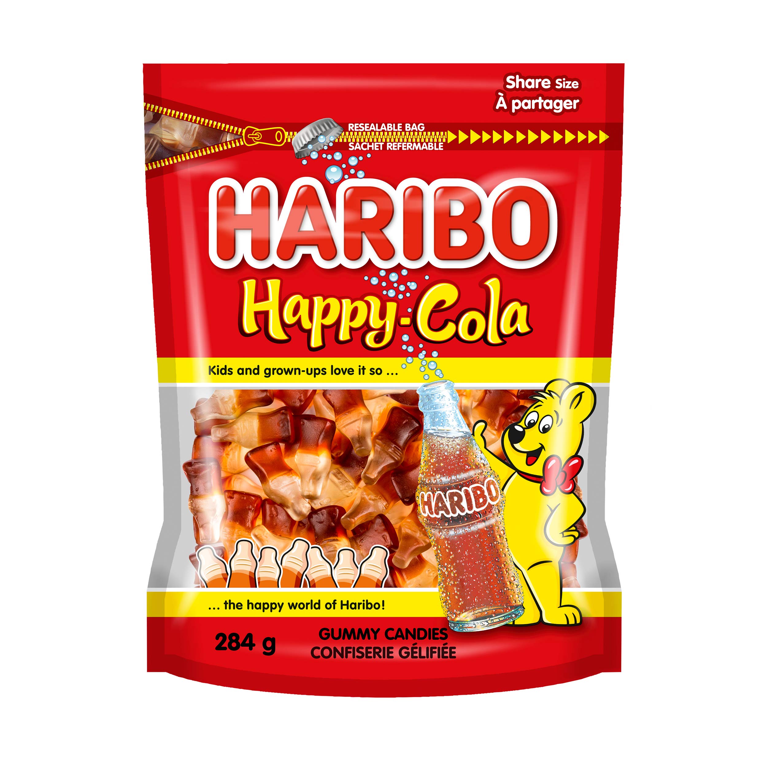Kids and grown-ups love it so, the happy world of HARIBO! For almost 100 years, Haribo has been crafting delicious treats for young and old alike. Quality and consistency is at the heart of every gummy candy that we make, so you know that this unmistakable gummy candy will be the same each and every time. For irresistible joy that's fun to share, grab a bag of our cola candy and enjoy a sweet treat by Haribo. Haribo Happy Cola gummies are a classic confectionary treat savoured by candy lovers of all generations. They have that unique nostalgic penny candy look, with Haribo's refreshing cola flavour. Our gummy candy is made without the use of artificial colours so you can feel good about serving them to friends and family, and the juicy taste and bouncy texture are sure to be a crowd pleaser. Haribo cola bottles are available in 3 convenient sizes, from resealable packs that are perfect for sharing with the family, to pre-packaged mini packs that are ideal for lunch bags and on-the-go snacks, to individual sized bags that are great to indulge in while relaxing on the couch.OVER 100 YEARS OF HARIBO: Haribo products were born in a home kitchen in 1920. With more than a century of candy-making know how to draw from, Haribo continues to treat lovers with classic gummy candies and exciting new favourites. NO ARTIFICIAL COLOURS: Haribo's Happy Cola bottles are made without the use of artificial colours so you can feel good about treating yourself or your family any day of the week. CONVENIENT RESEALABLE BAG: Our Happy Cola 284g bag is the perfect size for families who just love Haribo gummies Our resealable bag keeps your gummies fresh and makes sharing easy when out and about!. DELICIOUS COLA FLAVOUR: Haribo's thirst-quenching retro candy cola bottles are a bouncy and sweet classic bursting with real cola taste!. FUN COLA SHAPES: Happy Cola gummies come in fun bottle shapes and are naturally coloured to look half filled so you can recapture the joy of those penny candy favourites.