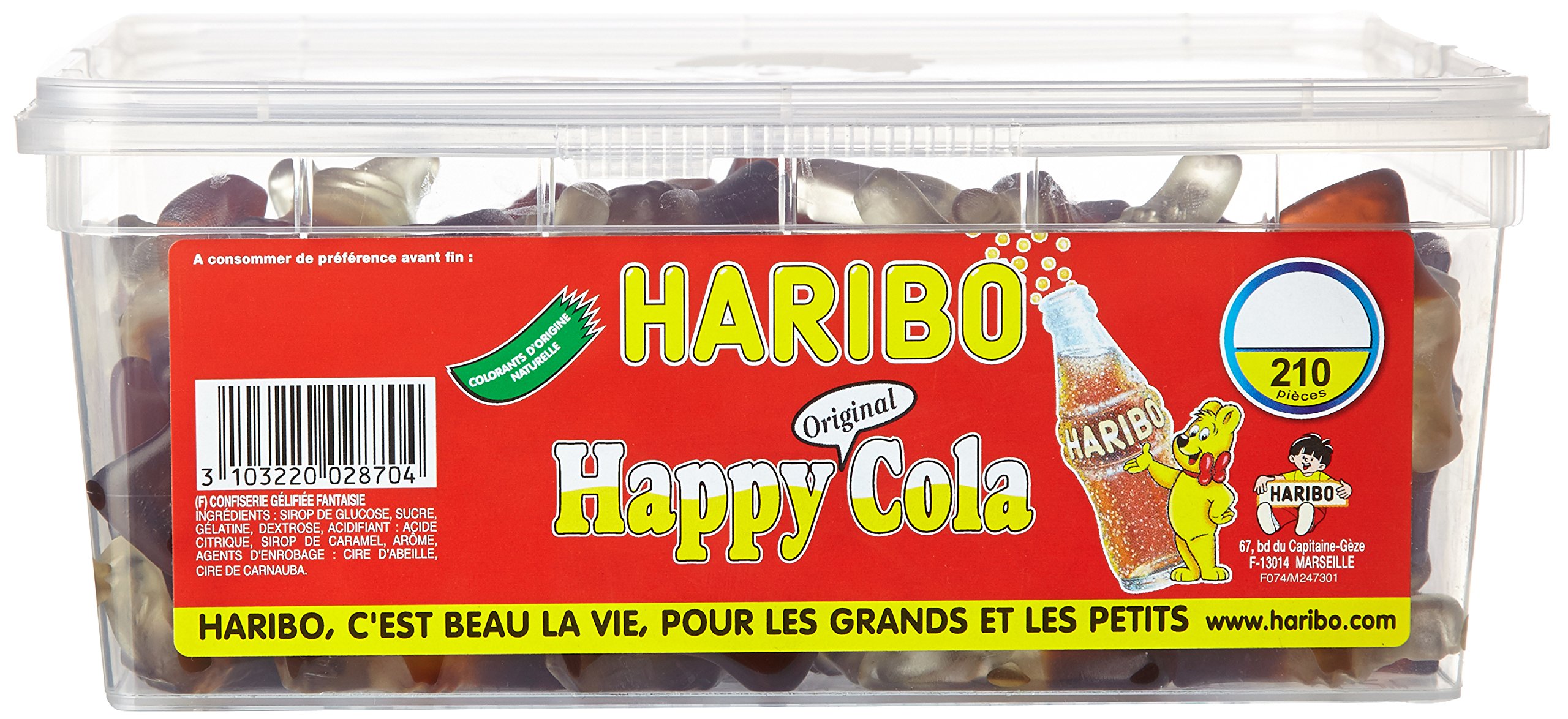 Haribo Happy Cola Jelly Candy x 210 Pieces 1.10 kg INGREDIENTS Haribo Happy Cola Jelly Candy x 210 Pieces 1.10 kgJelly candies. Haribo Bonbon Gélifié Happy Cola x 210 Pièces 1,10 kg INGRÉDIENTS Haribo Bonbon Gélifié Happy Cola x 210 Pièces 1,10 kgBonbons gélifiés.