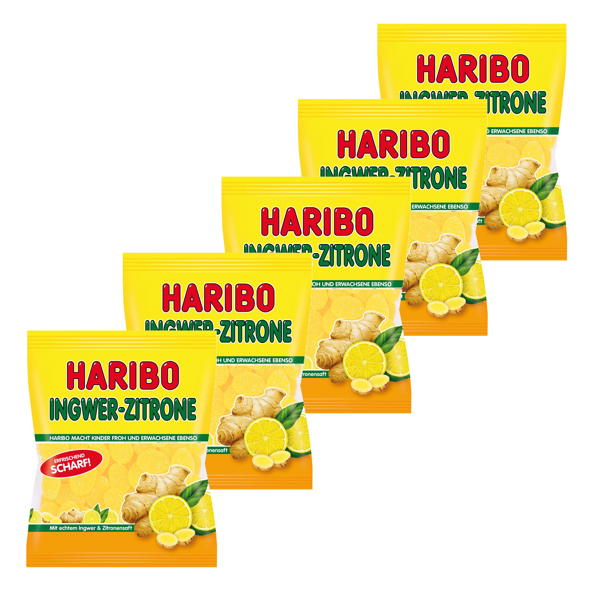 Haribo Ginger Lemon Gummy Bears, Wine Gum, Fruit Gum, in a 175g bag: HARIBO Ginger Lemon are candied fruit sticks in a delightful combination of spicy ginger and tangy lemon. The pleasantly invigorating note is achieved through the addition of real ginger concentrate. Net weight: 175g. Producer Manufactured for: HARIBO GmbH Co. KG, Hans-Riegel-Straße 1, 53129 Bonn - Germany. Ingredients: HA205: glucose syrup, sugar, turmeric, gelatin, concentrated lemon juice (2.3 ), acidifier: citric acid, malic acid, ginger concentrate, fruit and plant concentrate. Other ingredients: orange, elderberry, lemon, flavoring, glazing agent: carnauba wax, locust bean gum, invert sugar syrup. Contents: 5 x 1 Haribo lemon ginger gummies, gummy bears, wine gum, fruit gum, in a bag, 175g INSTRUCTIONS FOR USE Eat as is, chew and swallow.Haribo Lot de 5 bonbons gélifiés au gingembre et citron - En sachet Gingembre 5 Stück (1er Pack)DESCRIPTION DU PRODUIT DESCRIPTION DU PRODUIT Haribo gingembre, citron, oursons en gomme, gomme à vin, gomme fruitée, en sachet, 175 g : le gingembre HARIBO Citron est des bâtonnets de fruits confits dans une jolie combinaison de gingembre épicé et de citron aigre. La note agréablement tonifiante est obtenue grâce à l'ajout de véritable concentré de gingembre. Poids net : 175 g Producteur Fabriqué pour : HARIBO GmbH Co. KG, Hans-Riegel-StraÃe 1, 53129 Bonn - Allemagne, Ingrédients : HA205 : sirop de glucose, sucre, tourbillon, gélatine, jus de citron concentré de jus de citron (2,3 ), acidifiant : acide citrique, acide malique, concentré de gingembre, concentré de fruits et de plantes. Taux : orange, sureau baie, citron, arôme, agent d'enrobage : cire de carnauba, jus de fruit de caroube, sirop de sucre inverti. Contenu de la livraison : 5 x 1 citron Haribo gingembre, oursons en caoutchouc, gomme à vin, gomme aux fruits, en sachet, 175 g MODE D'EMPLOI Consommer tel quel, mâcher et avaler.