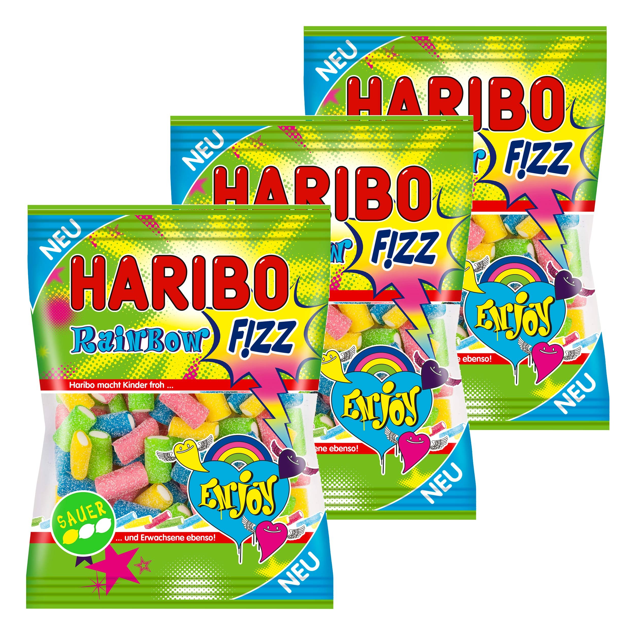 Haribo Rainbow Fizz, gummy bears, wine gum, fruit gums, sour, 175g: Haribo Rainbow from the Haribo F!ZZ sour family offers a sparkling taste experience in fruity flavors: blackcurrant, tropical strawberry, tropical apple, and tropical fruit. These sour gummies, with a mild acidity (level 1 of the syrup), are very popular with children and adults alike thanks to their rainbow colors. Storage instructions: Protect from heat and humidity. Produced manufactured for: Haribo GmbH Co. KG, Hans-Riegel-Straße 1, 53129 Bonn - Germany - Ingredients: HA253: sugar glucose syrup preservative: sorbite, sorbite syrup wheat flour dextrose palm fat citronellol, essential acid. Acids: Ingredients: tricalcium citrate, sodium malate, trinodium citrate, glazing agent: carnauba wax, gelatin, emulsifier: mono- and diglycerides of fatty acids, flavoring, fruit and plant concentrates: potato, blackcurrant, radish, colors: curcumin, PatBlue Duck V, lutein. Contents: 3 x 1 bag of Haribo Rainbow Fizz, gummy bears, fruit gums, acid, 175 g. INGREDIENTS Ingredients: sugar, glucose syrup, starch, humectant: sorbite, sorbitol syrup, acidifier: citric acid, apple acid, acidity regulator: tricalcium citrate, sodium malate, trinodium citrate, glazing agent: carnauba wax, wheat flour, palm fat, dextrose, egg white. Gelatin emulsifier: mono- and diglycerides of fatty acids flavoring fruit and plant concentrates: sweet potato, apple, radish, blackcurrant colorings: curcumin, patent blue V. May contain traces of milk. INSTRUCTIONS FOR USE Store the product in a cool, dry place. Consume the gummy candies directly from the packaging. See moreHaribo Rainbow Fizz Lot de 3 sachets de 175 g en caoutchouc de vinDESCRIPTION DU PRODUIT DESCRIPTION DU PRODUIT Haribo Rainbow Fizz, oursons en caoutchouc, gomme de vin, gommes fruitées, acide, 175 g : Haribo Rainbow de la famille acide Haribo F!ZZ offre une expérience gustative pétillante dans les saveurs fruitées : cassis, tropical fraise, pomme tropicale et tropicale. Les produits Balla candidés acide avec un acide doux (niveau 1 du siropème) sont très populaires auprès des petits et des grands avec leurs couleurs arc-en-ciel. Conseils de conservation : protéger de la chaleur et de l'humidité. Produit fabriqué pour : Haribo GmbH Co. KG, Hans-Riegel-StraÃe 1, 53129 Bonn - Allemagne - Ingrédients : HA253 : sucre sirop de glucose conservateur : sorbit, sirop de sorbit farine de blé dextrose graisse de palmier agent d'acide citronnique, acide essentiel. acides : Ingrédients : citrate de tricalcium, malate de sodium, citrate de trinodium, agent d'enrobage : cire de carnauba, gélatine, émulsifiant : mono et diglycérides d'acides gras alimentaires, arôme, concentrés de fruits et de plantes : pommes de terre, cassis, radis, colorants : Curcumine, PatBleu canard V, lutéine Contenu de la livraison : 3 x 1 sachet de Haribo Rainbow Fizz, oursons en caoutchouc, gommes fruitées, acide, 175 g. INGRÉDIENTS Ingrédients : sucre, sirop de glucose, amidon, humectant : sorbit, sirop de sorbite, acidifiant : acide citrique, acide pomme, régulateur d'acidité : citrate de tricalcium, malate de sodium, citrate de trinodium, agent d'enrobage : cire de carnauba, farine de blé, graisse de palmier, dextrose, blanc. ÉÉÉÉCENENENKE gélatine émulsifiant : mono et diglycérides d'acides gras alimentaires arôme concentrés de fruits et de plantes : patate douce, pomme, radis, cassis colorants : curcumine, bleu breveté V. Peut contenir des traces de lait. MODE D'EMPLOI Conservez le produit au sec et au frais. Consommez les bonbons gélifiés directement à partir de l'emballage. Voir plus