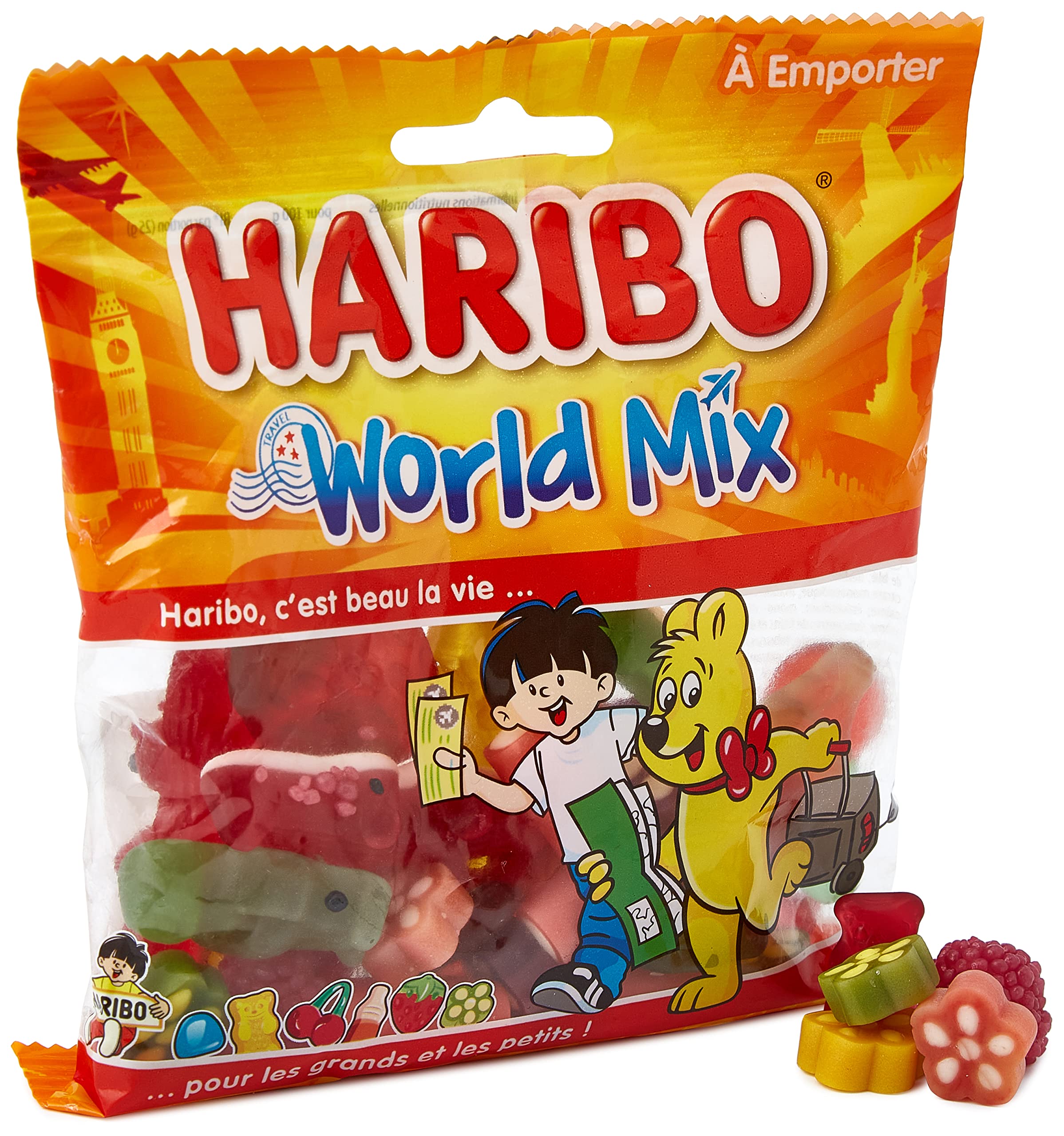 Haribo candy bag containing a mix of gummy candies. Bag contains 120g of inimitable sweet treats. INGREDIENTS Ingredients: glucose syrup, sugar, gelatin, WHEAT flour, dextrose, acids: citric acid, malic acid acidity regulators: monosodium citrate, sodium malate corn starch WHEAT starch palm fat emulsifier: mono- and diglycerides of fatty acids gelling agent: agar-agar flavoring fruit and plant concentrates: spirulina, safflower, apple, radish, blackcurrant, elderberry, aronia, grape, carrot, hibiscus, orange, lemon, mango, passion fruit elderberry extract caramel syrup Colorings: curcumin, vegetable carbon, vegetable carotenes, lutein, anthocyanins glazing agents: white and yellow beeswax, carnauba wax. INSTRUCTIONS FOR USE Not suitable for children under 3 years. This product is a 120g bag of mixed gummy candies. SAFETY WARNING Not suitable for children under 3 years. See moreHaribo World Mix 120 g 120 g (Lot de 1)DESCRIPTION DU PRODUIT DESCRIPTION DU PRODUIT Sachet de bonbon Haribo composé d'un mélange de bonbons gélifiés, Sachet contenant 120g de douceurs sucrés inimitable. INGRÉDIENTS Ingrédients: sirop de glucose, sucre, gélatine, farine de BLE, dextrose, acidifiants: acide citrique, acide malique correcteurs d'acidité: citrate monosodique, malate acide de sodium amidon de mais amidon de BLE graisse de palme émulsifiant: mono- et diglycerides d'acides gras gélifiant: agar-agar arôme concentrés de fruits et de plantes: spiruline, carthame, pomme, radis, cassis, baie de sureau, aronie, raisin, carotte, hibiscus, orange, citron, mangue, fruit de la passion extrait de baie de sureau sirop de caramel colorants: curcumine, charbon végétal, carotènes végétaux, lutéine, anthocyanes agents d'enrobage: cire d'abeille blanche et jaune, cire de carnauba. MODE D'EMPLOI Ne convient pas aux enfants de moins de 3 ans. Ce produit est un sachet de 120g de bonbons gélifiés mélangés. AVERTISSEMENT DE SÉCURITÉ Ne convient pas aux enfants de moins de 3 ans Voir plus