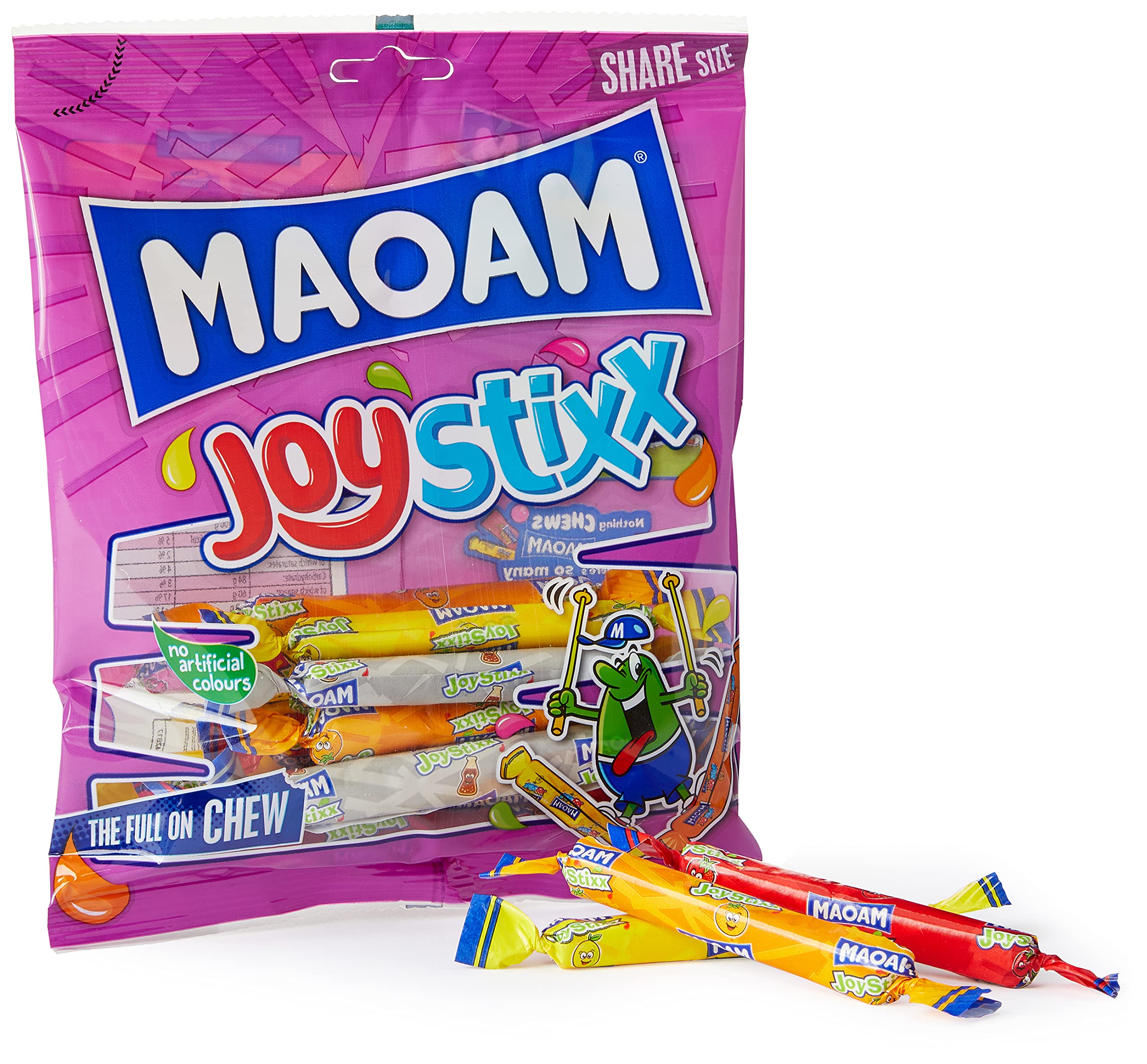 One box of twelve 140g bags of Joysticks Maoam, individually wrapped pieces of chewy candy with full-on flavor until it disappears. INGREDIENTS Sugar glucose syrup palm fat humectant: sorbitol syrup gelatin acid: citric acid flavoring. INSTRUCTIONS FOR USE Eat like regular candy. No recommended serving size or special precautions. SAFETY WARNING Store in a cool place away from direct sunlight. See more