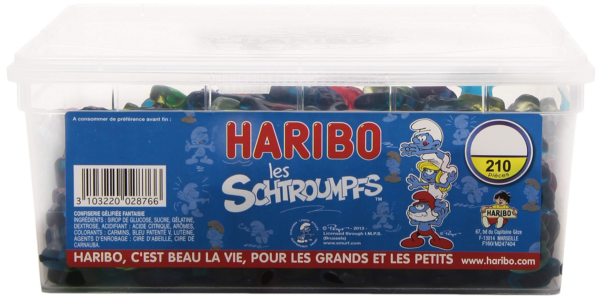 Technical description Brand: HARIBO Type of packaging: Large packaging Batch composition: 1 box Quantity: x1 Nutritional values: 100 g contain on average: Energy value 1380 kJ 320 kcal Protein 6.4 g Carbohydrates 73.6 g of which sugar 42.9 g Fat INGREDIENTS glucose syrup, sugar, gelatin, dextrose, acidifier: citric acid, flavorings, colors: carmines, patent blue v, lutein, glazing agents: beeswax, carnauba wax. SAFETY WARNING Not suitable for children under 3 years Composition of the lot: 1 box. Descriptif technique Marque :HARIBOType de conditionnement :Gros conditionnementComposition du lot :1 boîteQuantité :x1Valeurs nutritionnelles :100 g contiennent en moyenne : Valeur énergétique 1380 kJ 320 kcal Protéines 6,4 g Glucides 73,6 g dont sucre 42,9 g Lipides INGRÉDIENTS sirop de glucose, sucre, gélatine, dextrose, acidifiant : acide citrique, arômes, colorants : carmins, bleu patenté v, lutéine, agents d'enrobage : cire d'abeille, cire de carnauba. AVERTISSEMENT DE SÛRETÉ Ne convient pas aux enfants de moins de 3 ans Composition du lot : 1 boîte.