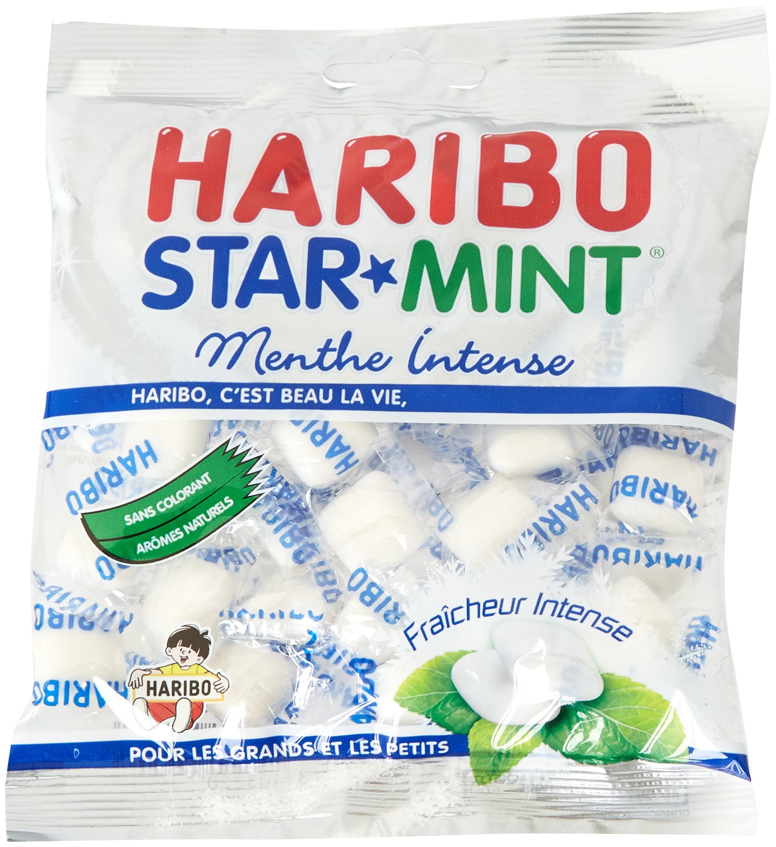 Individually wrapped, gluten-free mint candy bag. Bag containing 120g of inimitable sweet treats. INGREDIENTS Ingredients: Sugar Glucose Syrup Starch Natural Mint Flavoring with other Natural Flavorings Glazing Agent: Carnauba Wax DIRECTIONS FOR USE Can be consumed at any time of day. SAFETY WARNING Not suitable for children under 3 years Not suitable for children under 3 years old. 100g plastic bag. Haribo sweets. sachet de bonbon à la menthe emballé individuellement et sans gluten. Sachet contenant 120g de douceurs sucrés inimitable. INGRÉDIENTS Ingrédients: sucre sirop de glucose amidon arôme naturel de menthe avec autres arômes naturels agent d'enrobage: cire de carnauba MODE D'EMPLOI peut se consommer à tout moment de la journée. AVERTISSEMENT DE SÛRETÉ Ne convient pas aux enfants de moins de 3 ans Ne convient pas aux enfants de moins de 3 ans. Sachet plastique de 100g. Bonbons Haribo.