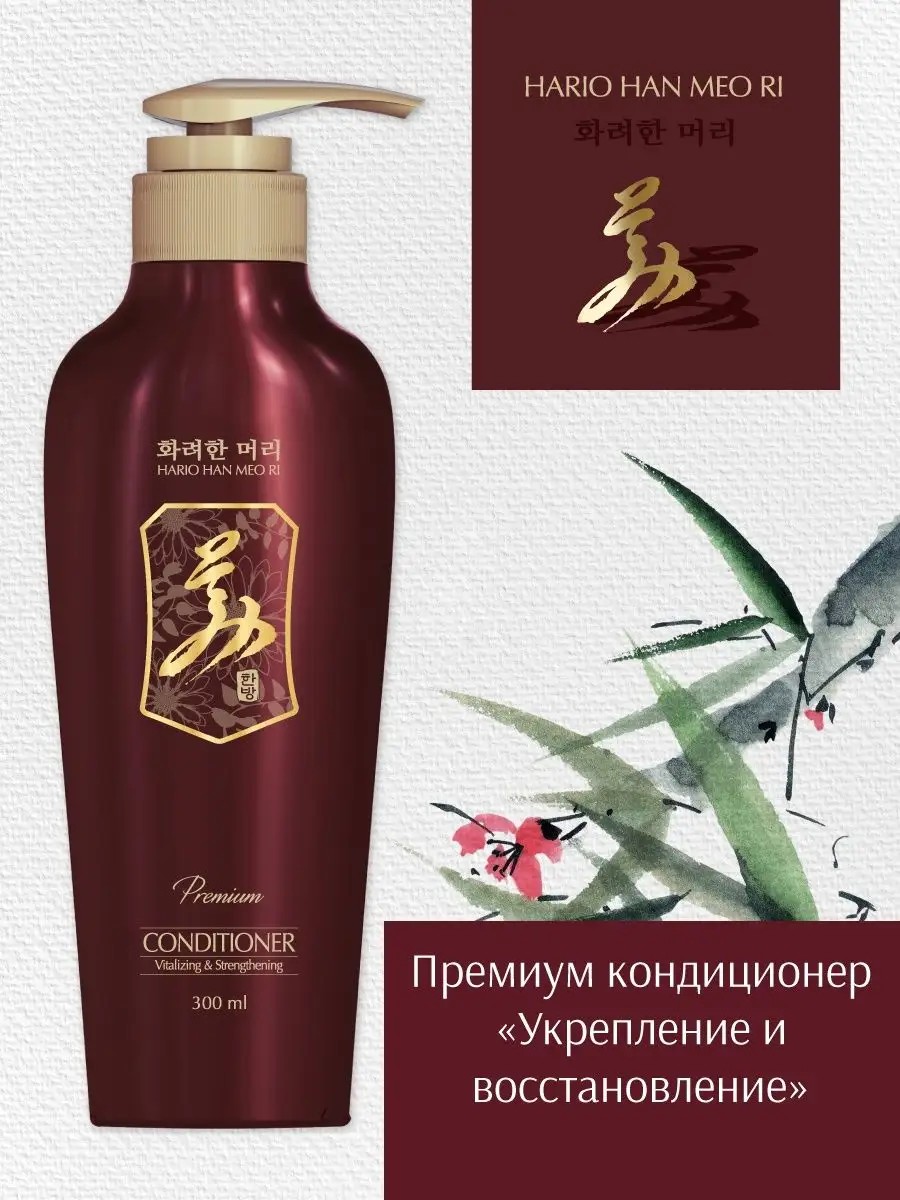 Премиум кондиционер Укрепление и восстановление на основе традиционных корейских лекарственных растений активно восстанавливает волосы после окрашивания, регулярных сушек и химической завивки, возвращает силу и прочность. Гидролизированные шелк и кератин в сочетании с комплексом лекарственных экстрактов женьшеня, хризантемы, жимолости японской, лотоса, ежевики, опунции и граната, питают и укрепляют корни, стимулируют рост волос. Волосы приобретают блеск и шелковистость, легко расчесываются и укладываются.
