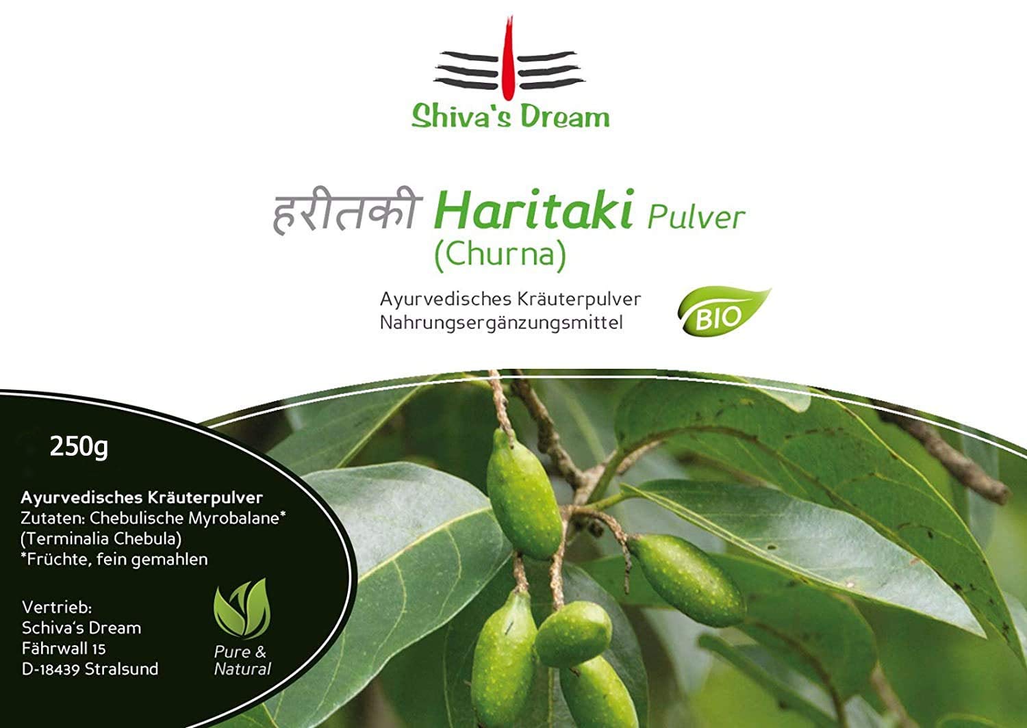 Haritaki is one of the most famous Ayurvedic means and is used in a variety of ways.It is considered one of the royal herbs of Indian original medicine.Haritaki from Shivas Dream comes from India and is provided with the organic seal.The guidelines in other countries are significantly higher than the German or European organic seal. Ingredients / ingredients Ground Haritaki powder 100% in Instructions Take 3 g with sufficient water on a daily basis, ideally go right before going to sleep LEGAL NOTICE Vegan's dietary supplement - herbal powder from Terminalia Chebula (Haritaki) or also called Chebulic Myrobalan, from controlled organic cultivation This product correlates according to Ayurveda at the level of the harmonious balance of the dosha* by balance the six flavors.It supplies herb, sweet, sour, bitter and sharp with the flavors.Free of gluten, lactose suitable for vegans and vegetarians.Raw food qualification#t More