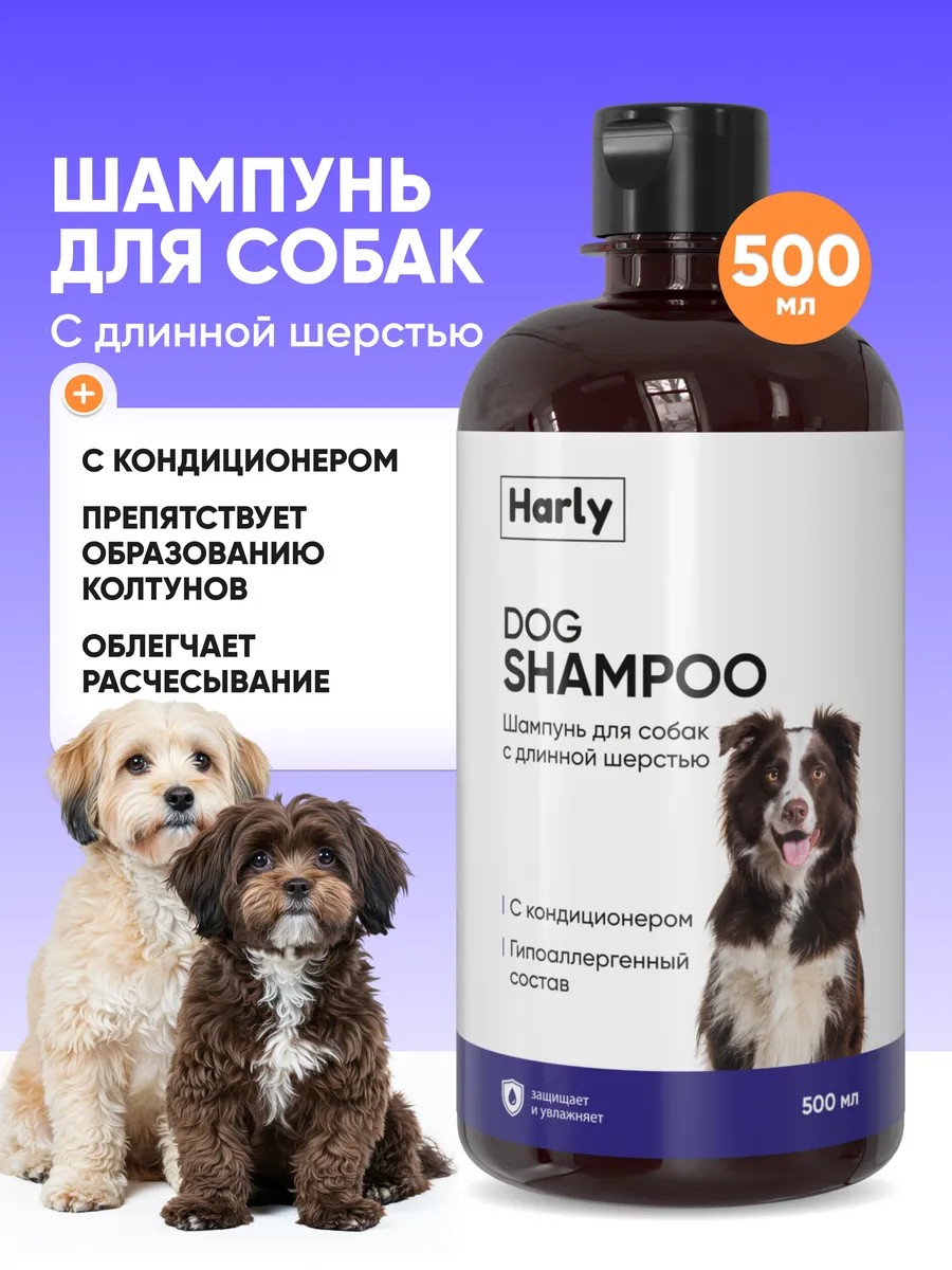 Шампунь для собак Harly 500 мл для заботы о шерсти длинношерстных собак. Гипоаллергенный шампунь для собак, обогащенный пантенолом, бережно очищает и ухаживает за чувствительной кожей. Он подходит для собак всех пород, включая щенков от 6 месяцев. Кондиционер в составе делает шерстку блестящей и объемной, а также убирает статическое электричество. Шампунь для собак с длинной шерстью помогут поддерживать свежесть и чистоту вашего любимца. Кроме того, он препятствует образованию колтунов, облегчая расчесывание и делая процесс ухода за шерстью приятным. Очищающий собачий шампунь безопасен для щенков, благодаря чему он подойдет даже для самой чувствительной кожи и лап. Пантенол эффективно снимает воспаления и успокаивает раздраженную кожу питомца, что делает его особенно полезным для собак с чувствительной кожей. Шампунь подходит для йорков, а также для чихуахуа и других мелких пород собак. Используйте после прогулок, чтобы удалить загрязнения, устранить запах псины и предотвратить спутывание шерсти.
