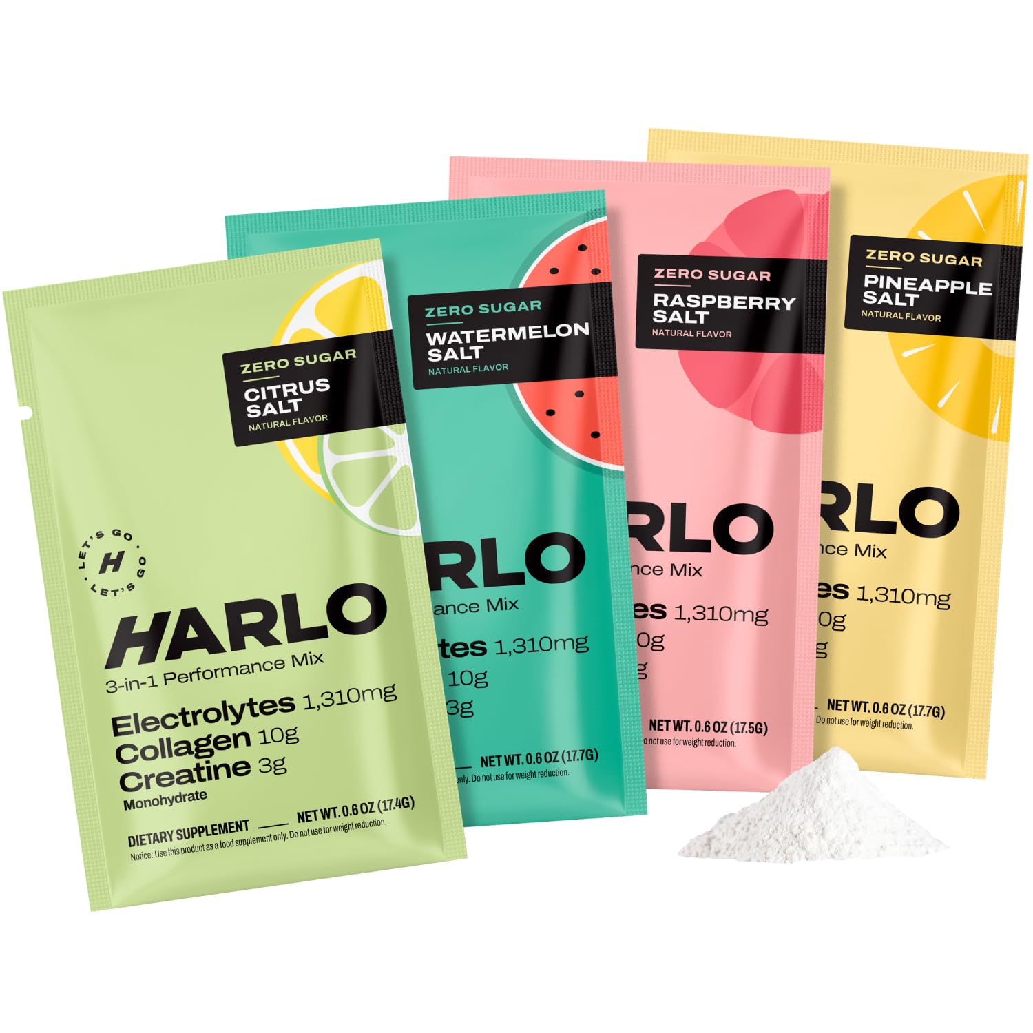 Harlo Electrolytes Powder Sachet Sampler 3-in-1 High Sodium Hydration for Intense Training | with Creatine & Collagen | Zero Sugar | Salty by Design | 4-Flavor Trial (4 Sachets)