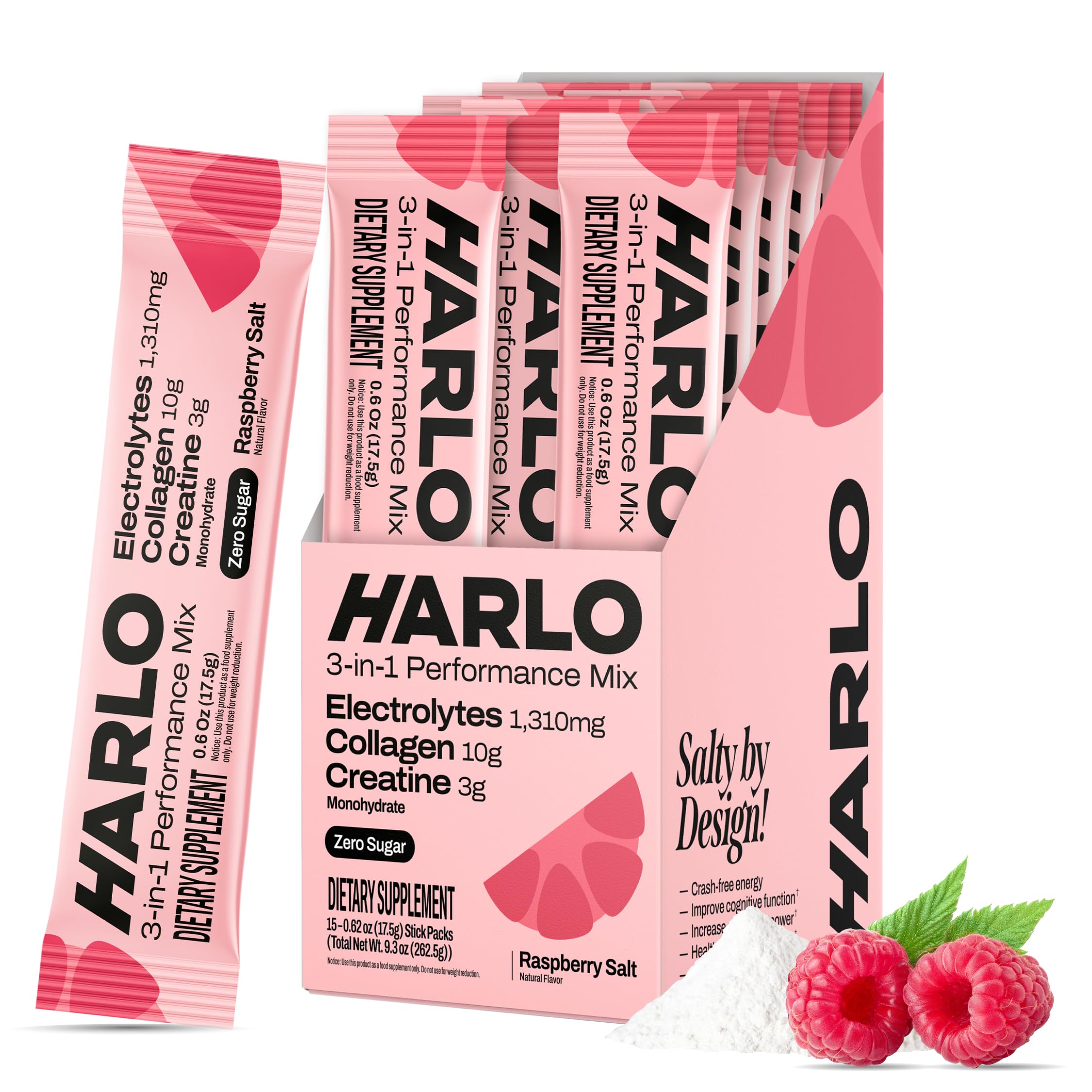 Harlo Electrolytes Powder Stick Packs 3-in-1 High Sodium Hydration for Intense Training | with Creatine & Collagen | Zero Sugar | Salty by Design | Raspberry Salt (15 Stick Packs)