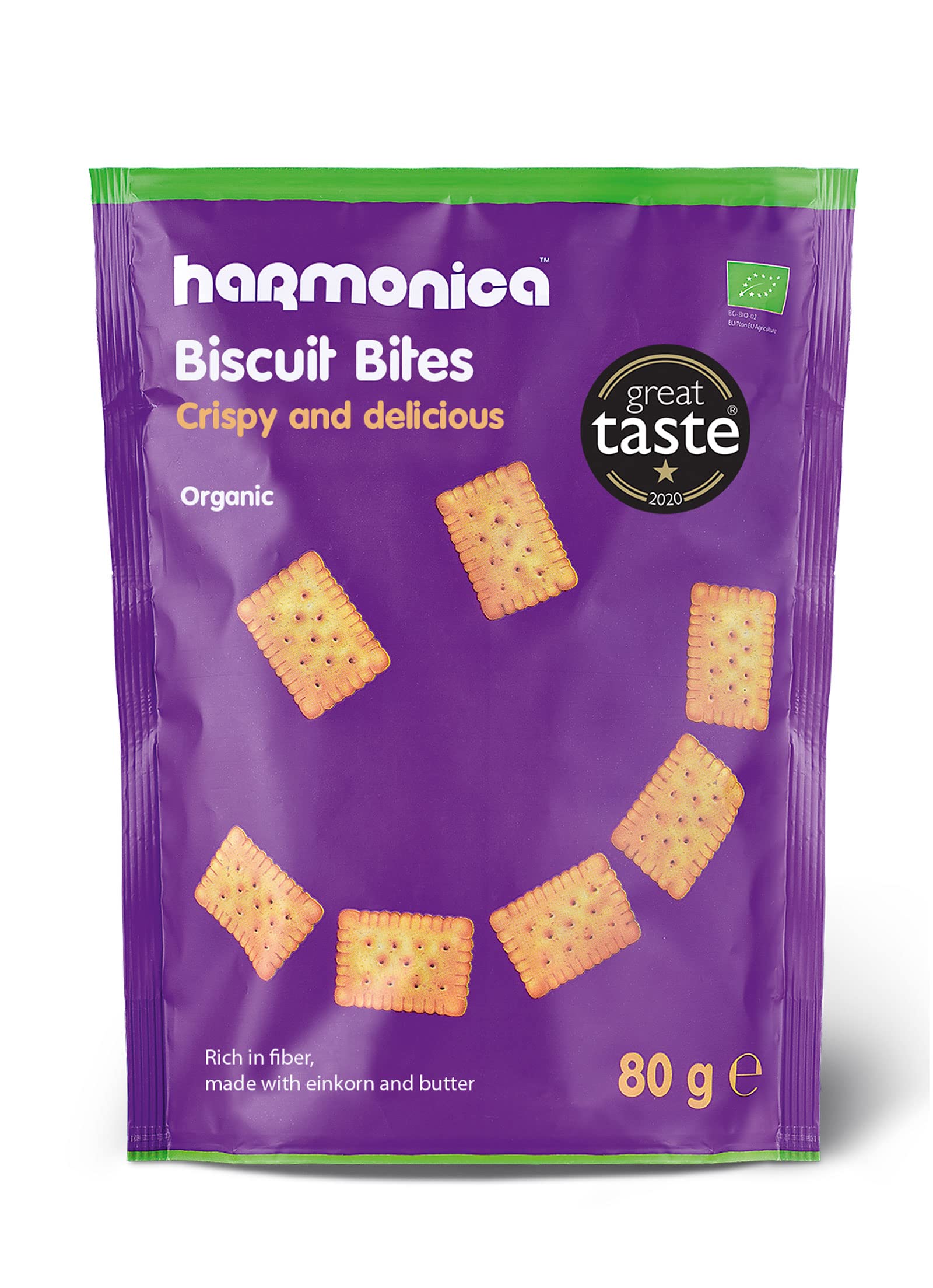 These cute, neat little biscuits have a lovely lightness, an airy crunch, and a sweet, rich, buttery aroma. Haiku, an award-winning 2020 product, is made with wholemeal einkorn flour and great-tasting cow's ghee. High in fiber and simply irresistible in taste. Wholemeal einkorn flour is richer in fiber and is an ancient indigenous crop that has been preserved to this day without hybridization or crossbreeding. Cow's ghee is used for its fantastic flavor and high smoke point. No starch, no glucose-fructose syrup or refined fats, no brightening agents, no preservatives, and no stabilizers. Perfect for children and adults alike. Just the right size, convenient for carrying. Ideal for breakfast, long walks, and travel. We also suggest dipping them in cream cheese or morning coffee. Ingredients: Organic einkorn flour (31.8 ), organic white wheat flour, organic cow ghee (7.69 ), organic sugar, organic milk powder, organic malt extract, Himalayan salt, organic vanilla, raising agent, sodium bicarbonate, ammonium bicarbonate, enzyme.Harmonica Biscuits biologiques - 80 g Farine d'Einkorn et ghee de vache entier Riche en fibres Sucre biologique Sans huile de palme Sans OGMDESCRIPTION DU PRODUIT Ces mignons, petits biscuits soignés ont une lumière très agréable, un crunch aéré et un arôme doux riche en beurre. Haïku primé de farine d'einkorn et de ghee de vache à grand goût 2020. Riche en fibres et tout simplement irrésistible au goût. La farine d'einkorn entière est plus riche en fibres et est une ancienne culture indigène qui a été conservée à ce jour sans hybridation ni croisement. Ghee de vache en raison de son goût fantastique et son point de fumer élevé. Pas d'amidon, pas de sirop de glucose-fructose et de graisses raffinées, pas d'agents brillants, pas de conservateurs et pas de stabilisants. Parfait pour les enfants et les adultes. Juste la bonne taille, pratique pour le transport. Idéal pour le petit déjeuner, les longues promenades et les voyages. Nous suggérons également de les tremper dans du fromage à la crème ou du café du matin. Ingrédients: farine d'einkorn biologique (31,8 ), farine de blé blanc biologique, ghee de vache biologique (7,69 ), sucre biologique, lait en poudre organique, extrait de malt biologique, sel de l'Himalaya, vanille biologique, agent montant, bicarbonate de sodium, bicarbonate d'ammonium, enzyme.
