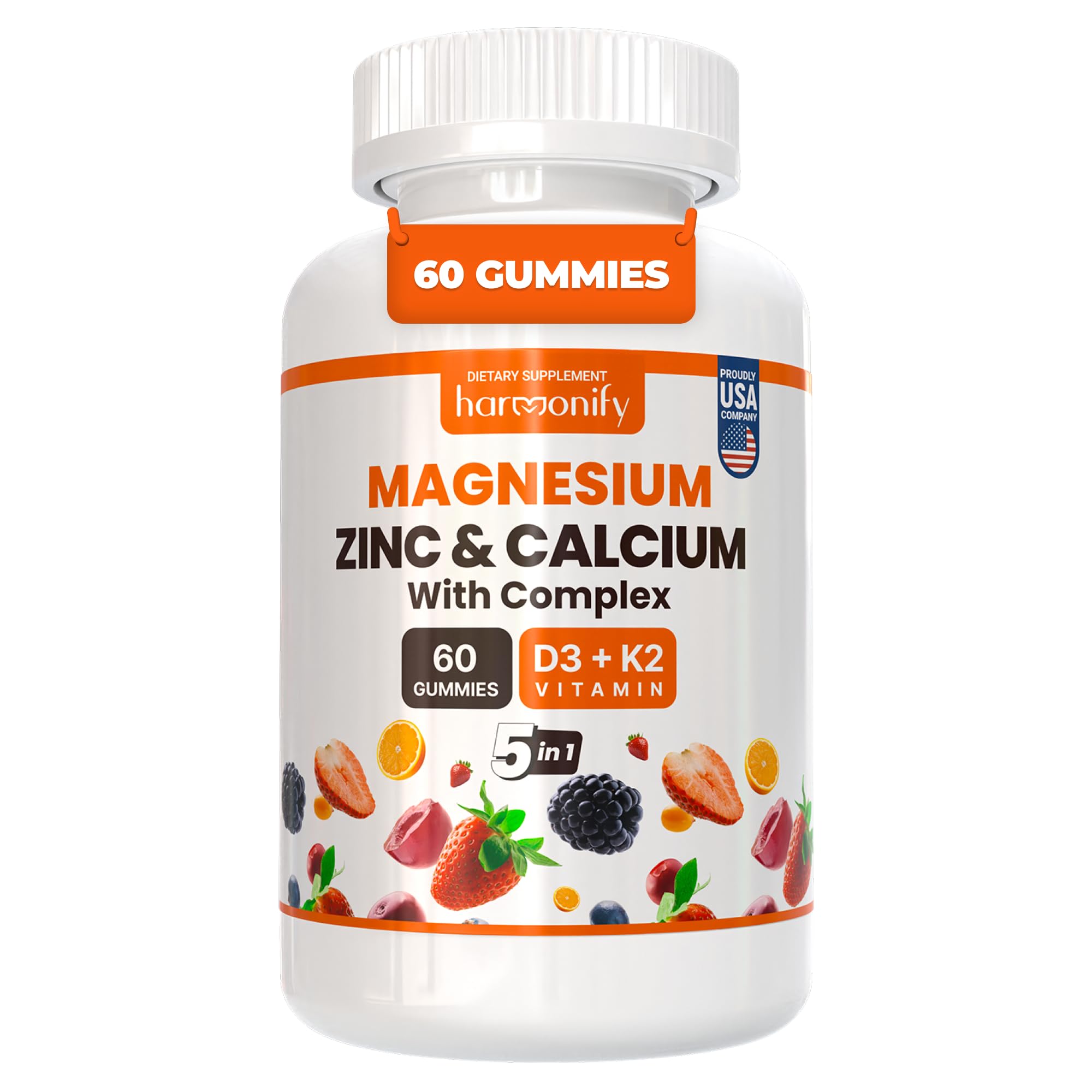 No high fructose corn syrup. Introducing HARMONIFY Magnesium Calcium Zinc With Vitamin D3 K2 Gummies, a premium multivitamin supplement designed to support bone and immune health for both women and men. Our carefully crafted gummies are packed with essential nutrients, including Magnesium, Calcium, Zinc, Vitamin D3, and K2, to promote overall well-being. With a convenient 30-day supply, our gummies provide a delicious and hassle-free way to ensure you're getting the vital nutrients your body needs.