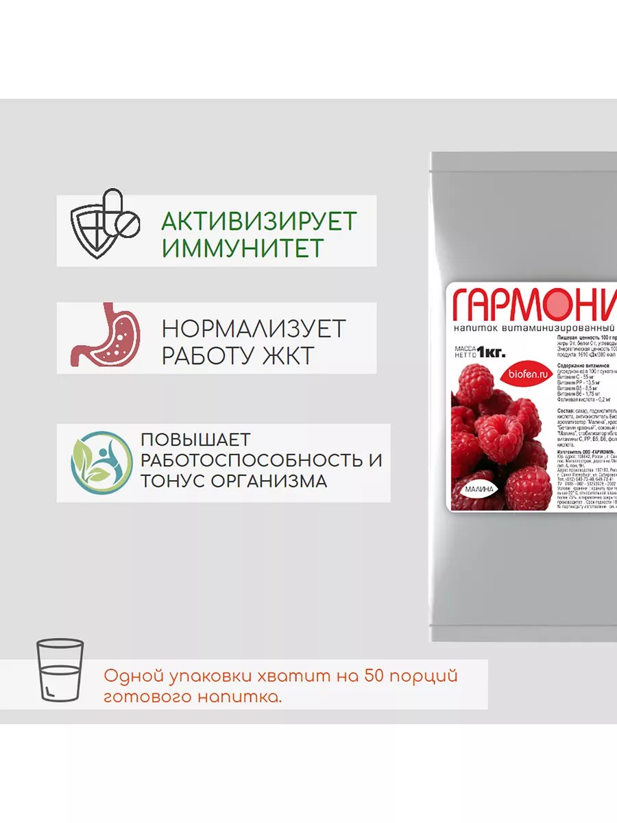 The vitamin-enriched dry drink "Harmony" with Biofen is recommended by the Russian Academy of Medical Sciences' Influenza Institute for immune support and overall health. This concentrated mixture makes a delicious and healthy drink in just a few seconds.