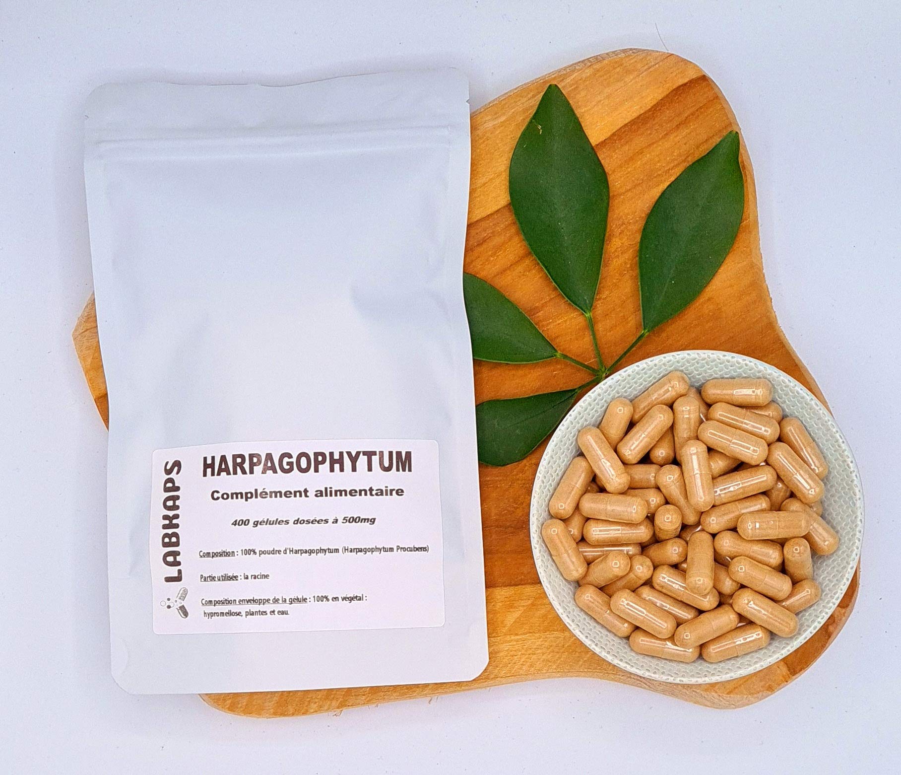 Devil's claw grows mainly in the semi-desert regions of Southern Africa. The majority of wild populations are found in Namibia (40 of annual production) and Botswana. This perennial plant is very widespread in the veldt of the Transvaal, in the steppes of Namibia as well as in the Kalahari desert, on clayey, sandy soils cleared of all, or almost all, natural vegetation. In these wild and arid regions of Namibia, Botswana and Angola. Devil's claw also thrives in dry regions of Madagascar, although it occurs there in small quantities. Directions for use: 2 to 4 capsules day to swallow with a large glass of water to supplement a varied and balanced diet. Do not exceed the recommended daily dose. Do not leave within reach of young children. Store away from light, heat and humidity. Not recommended in case of ulcer or gallstones. For 4 capsules: 2000 mg of Harpagophytum INGREDIENTS 100 Harpagophytum powder (Harpagophytum Procubens)100 plant-based. 100 NATURAL: All ingredients are of natural origin, gluten-free, fructose-free, lactose-free, and GMO-free. VEGAN product. FRENCH QUALITY: We manufacture our food supplements in France. Our goal is to guarantee you the best quality price ratio. We check each batch for the presence of pesticides, bacteria, and heavy metals to offer you a product of impeccable quality at a low price. La griffe du Diable pousse essentiellement dans les régions semi-désertiques de l'Afrique Australe. La majorité des populations sauvages se trouvent en Namibie (40 des productions annuelles) et au Botswana. Cette plante vivace est très répandue dans le veldt du Transvaal, dans les steppes de la Namibie ainsi que dans le désert du Kalahari, sur des sols argileux, sablonneux et défrichés de toute végétation naturelle, ou presque. Dans ces régions sauvages et arides de la Namibie, du Botswana et de l'Angola. La griffe du diable se plaît également dans régions sèches de Madagascar, bien qu'elle s'y figure en faible quantité. Conseil d'utilisation : 2 à 4 gélules jour à avaler avec un grand verre d'eau à prendre en supplémentation d'une alimentation variée et équilibrée. Ne pas dépasser la dose quotidienne recommandée. Ne pas laisser à la portée des jeunes enfants. Conserver à l'abri de la lumière, de la chaleur et de l'humidité. Déconseillé en cas d'ulcère ou de calculs billiaires. Pour 4 gélules : 2000 mg d'Harpagophytum INGRÉDIENTS 100 poudre d'Harpagophytum (Harpagophytum Procubens)100 d'origine végétale. 100 NATUREL : Tous les ingrédients sont d'origine naturelle, sans gluten, sans fructose, sans lactose et sans OGM. Produit VEGAN. QUALITÉ FRANÇAISE : Nous fabriquons nos compléments alimentaires en France. Notre volonté est de vous garantir le meilleur rapport qualité prix. Nous contrôlons pour chaque lot la présence de pesticides, de bactéries, de métaux lourds pour vous offrir un produit d'une qualité irréprochable à petit prix.