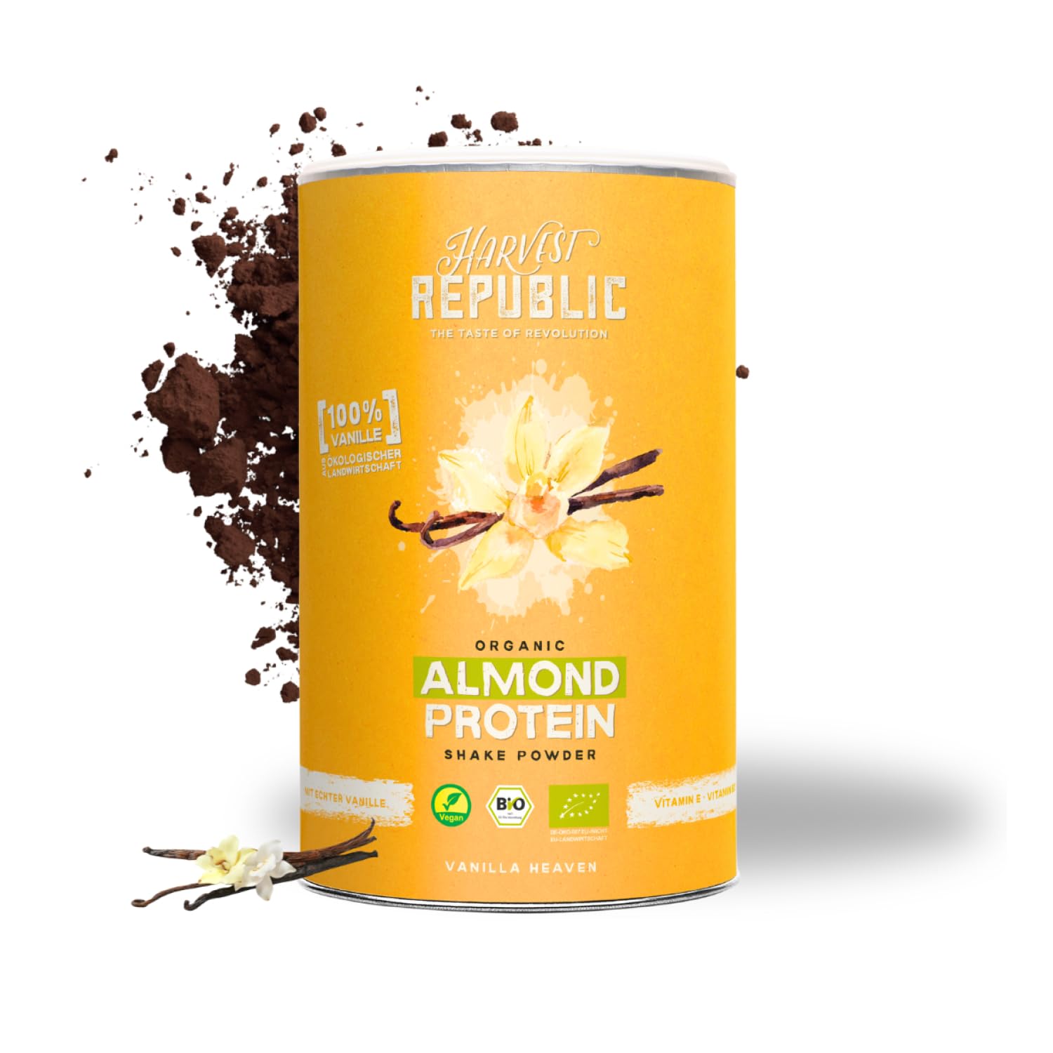 Our vegan protein powder is the perfect choice for a healthy, protein-rich diet – ideal for both amateur and professional athletes. With a complete amino acid profile and a high concentration of BCAAs, our almond protein perfectly complements your natural diet. Whether you want to build or lose weight, our vegan protein powder helps you achieve your training goals. Shakes are quick and easy to prepare, offering a delicious way to get enough protein and vitamins every day. It's also ideal as a base for protein powder and vegan pancakes. The fact that our organic almond protein contains so many valuable ingredients isn't just due to the superior quality of the almonds. The particularly gentle process with which they are processed ensures that all the goodness is retained. First, the organic almonds are peeled, then steam-blanched, dried, and cold-pressed. During cold pressing, no additional energy is supplied, only the heat generated by the pressing itself. The temperature is a maximum of 40 C. Grinding is carried out using a product-friendly cryogenic process, in which oxygen is displaced. Here too, low temperatures are used, so valuable ingredients are preserved, including vitamins B2, B3, and E, as well as calcium, iron, and magnesium. This superior production is reflected in the slightly sweet taste, aroma, and clear color of our vegan protein powder. Our vegan protein shakes provide natural proteins and essential vitamins for your health. They support muscle building, strengthen hair and skin, and boost the immune system. With our vegan protein powder shakes, such as almond protein and pea protein powder, you get an extra serving of protein and vitamins – ideal for a busy daily life. INGREDIENTS Hemp protein, almond protein, vanilla powder, raw cane sugarHARVEST REPUBLIC Protéines d'amande bio en poudre vanille avec véritable vanille bio 320 g de poudre de protéines végétaliennes Jusqu'à 14 g de protéines par portion Poudre de protéines bio sansDESCRIPTION DU PRODUIT DESCRIPTION DU PRODUIT Notre poudre de protéines végétaliennes est le choix parfait pour une alimentation saine et riche en protéines - Idéale pour les sportifs amateurs et les professionnels. Avec un profil complet en acides aminés et une forte concentration de BCAA, notre protéine d'amande complète parfaitement votre alimentation naturelle. Que vous souhaitiez développer ou perdre du poids, notre poudre de protéines végétaliennes vous aide à atteindre vos objectifs d'entraînement. Les shakes sont préparés rapidement et facilement et vous offrent au quotidien une délicieuse façon de vous fournir suffisamment de protéines et de vitamines. Idéal également comme base pour la poudre de protéines, pancakes végétaliens. Le fait que notre protéine d'amande bio contient autant d'ingrédients précieux n'est pas seulement dû à la qualité supérieure des amandes. Le procédé particulièrement doux avec lequel elles sont traitées garantit que tout ce qui est bon reste contenu. Tout d'abord, les amandes biologiques sont pelées, puis blanchies à la vapeur d'eau, séchées et pressées mécaniquement à froid. Lors de la pression à froid, aucune énergie supplémentaire n'est fournie, seulement la chaleur générée par le pressage lui-même. La température est de 40 C maximum. Le broyage est effectué selon un procédé cryogène respectueux du produit, dans lequel l'oxygène est déplacé. Ici aussi, les basses températures sont utilisées, de sorte que des ingrédients précieux sont préservés, y compris les vitamines B2, B3 et E, ainsi que le calcium, le fer et le magnésium. Cette production de qualité supérieure se reflète dans le goût légèrement doux, l'odeur et la couleur claire de notre poudre de protéines végétaliennes. Nos shakes protéinés végétaliens fournissent des protéines naturelles et des vitamines essentielles à votre santé. Elles favorisent la formation musculaire, renforcent les cheveux et la peau, et favorisent la défense immunitaire. Avec nos shakes en poudre de protéines végétaliennes telles que la protéine d'amande et la poudre de protéines de pois, vous obtenez une portion supplémentaire de protéines et de vitamines – Idéal pour une vie quotidienne stressante. INGRÉDIENTS Protéines de chanvre, protéines d'amande, poudre de vanille, sucre de canne brutIdéal pour les shakes : étant donné que notre protéine d'amande bio est un concentré d'amande 100 pure et bio sans additifs, elle déploie son excellente solubilité et sa consistance crémeuse au mieux dans un shaker ou un mélangeur. Sans additifs : sans arômes chimiques ni édulcorants. Notre poudre de protéines est exempte de colorants, de saveurs et de conservateurs artificiels. Le résultat : poudre de protéines biologiques de qualité supérieure. PROTÉINE D'AMANDE CONCENTRÉE : fabriquée à partir d'amandes issues de l'agriculture biologique contrôlée - sans OGM. Grâce à la finition douce, tous les ingrédients précieux sont préservés. Seulement trois ingrédients : notre protéine d'amande végétalienne en poudre de vanille est composée de protéines d'amande bio, de vanille bio véritable et de sucre de canne biologique. Goût naturel : notre protéine d'amande vanille contient de la véritable vanille bio pour un goût particulièrement délicieux et naturel. Pas d'arômes artificiels – seulement un pur plaisir.