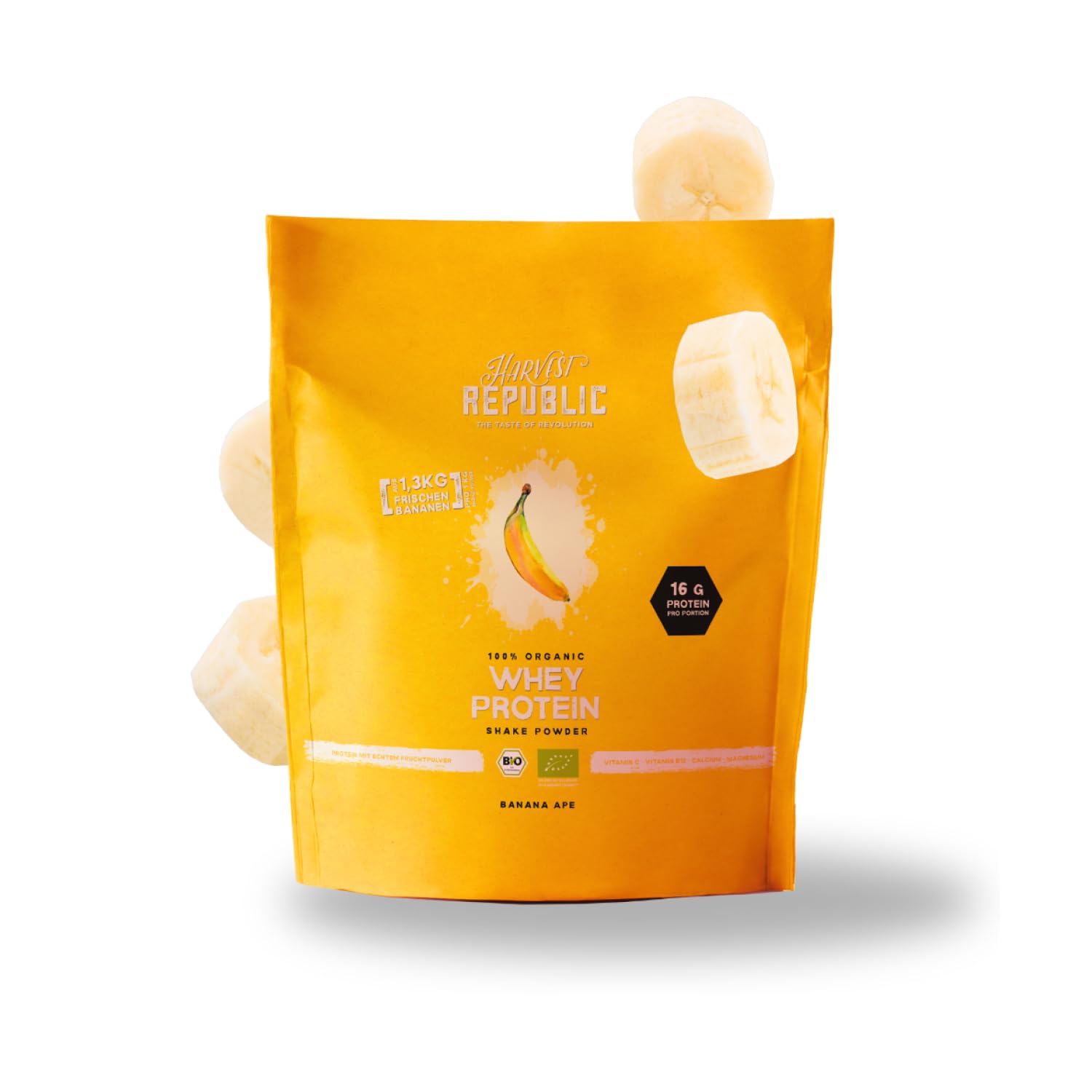 Discover a healthy, protein-rich diet with our organic protein powder – perfect for amateur and professional athletes. Our protein powder offers real added value for nutrition-conscious individuals by optimally supplementing their natural diet with a complete amino acid profile and a high concentration of BCAAs. Whether for muscle building or weight management, our whey protein powder effectively helps you achieve your training goals. Our protein shake is quick and easy to prepare, providing you with high-quality protein and essential nutrients in under a minute. With fresh, natural flavors like vanilla, banana, and strawberry protein powder, every sip is a treat, whether enjoyed as a breakfast smoothie or a nutritious snack. Our protein blend is made from 100 pure organic ingredients, with no additives or artificial flavors. The excellent taste comes from pure organic whey protein, pure organic fruit powder, and a subtle, natural sweetness. Over 300g of organic bananas, rich in vitamin C, potassium, and magnesium, ensure full power in every shake. So you get not only a super tasty whey protein product, but also a particularly valuable one that supports your fitness goals and a healthy diet. Whether you prefer organic whey protein or whey protein powder, our whey protein powder and neutral protein powder offer everything you need for your goals. And best of all: our protein powder, free from artificial sugar, helps you eat healthily and mindfully without sacrificing taste. INGREDIENTS Whey protein concentrate powder, banana powder (18.5 ), raw cane sugarIdeal for shakes: Because our whey protein is a 100 pure organic whey concentrate with no additives, it delivers its excellent solubility and creamy consistency best in a shaker or blender. No additives: No artificial flavors or sweeteners. Our protein powder is free of artificial colors, flavors, and preservatives. The result: Premium organic protein powder. 100 organic whey protein powder: Protein powder made from delicately concentrated organic whey. For our special whey protein, we only source whey from organic cows – from Germany and Austria. Just three ingredients: Our banana protein powder is made from organic whey protein, freeze-dried bananas, and organic cane sugar. Rich in vital nutrients – For delicious and nutritious shakes. A true fruit delight: 431g of organic bananas, rich in vitamin C, calcium, and magnesium. With 27 fruit, we use only natural fruit. No artificial flavors – just pure taste.HARVEST REPUBLIC Protéines de lactosérum bio en poudre banane avec 100 de poudre de fruits véritables 750 g de poudre de protéines biologiques affinées avec des fruits lyophilisés Jusqu'à 16 g Banane 750 gDESCRIPTION DU PRODUIT DESCRIPTION DU PRODUIT Découvrez une alimentation saine et riche en protéines avec notre poudre de protéines biologiques – Parfait pour les sportifs amateurs et professionnels. Notre poudre de protéines offre une véritable valeur ajoutée aux personnes soucieuses de leur nutrition en complétant de manière optimale leur alimentation naturelle avec un profil complet d'acides aminés et une forte concentration de BCAA. Que ce soit pour le développement musculaire ou la gestion du poids, notre poudre de protéines de lactosérum vous aide efficacement à atteindre votre objectif d'entraînement. Notre shake protéiné est préparé rapidement et facilement et vous fournit en moins d'une minute des protéines de qualité supérieure et des substances vitales essentielles. Avec des saveurs naturelles et fraîches telles que la vanille, la banane et la poudre protéinée de fraise, chaque gorgée devient un régal, que ce soit comme smoothie pour le petit-déjeuner ou comme collation nutritive. Notre mélange de protéines est composé à 100 d'ingrédients biologiques purs, sans additifs ni arômes. L'excellent goût provient de protéines de lactosérum biologiques pures, de poudre de fruits bio purs et d'une douceur subtile et naturelle. Plus de 300 g de bananes biologiques, riches en vitamine C, en potassium et en magnésium, assurent une pleine puissance à chaque shake. Ainsi, vous obtenez non seulement un produit à base de protéines de lactosérum super savoureux, mais aussi particulièrement précieux qui soutient vos objectifs de fitness et une alimentation saine. Qu'il s'agisse de protéines de lactosérum bio ou de protéines de lactosérum en poudre, notre poudre de protéines de lactosérum et de protéines neutres offre tout ce dont vous avez besoin pour vos objectifs. Et le meilleur : notre poudre de protéines sans sucre artificiel vous aide à manger sainement et consciemment sans renoncer au goût. INGRÉDIENTS Poudre concentrée de protéines de lactosérum, poudre de banane (18,5 ), sucre de canne brutIdéal pour les shakes : étant donné que notre protéine de lactosérum est un concentré de lactosérum biologique 100 pur sans additifs, elle déploie son excellente solubilité et sa consistance crémeuse au mieux dans un shaker ou un mélangeur. Sans additifs : sans arômes chimiques ni édulcorants. Notre poudre de protéines est exempte de colorants, de saveurs et de conservateurs artificiels. Le résultat : poudre de protéines biologiques de qualité supérieure. Poudre de protéines de lactosérum 100 bio : poudre de protéines obtenue à partir de lactosérum bio délicatement concentré. Pour notre protéine de lactosérum spéciale, nous n'achetons que du lactosérum provenant de vaches biologiques – d'Allemagne et d'Autriche. Seulement trois ingrédients : notre poudre protéinée banane est composée de protéines de lactosérum bio, de bananes lyophilisées et de sucre de canne biologique. Riche en substances vitales - Pour des shakes délicieux et précieux. Véritable plaisir de fruits : 431 g de bananes biologiques, riches en vitamine C, calcium et magnésium. Avec 27 de fruits, nous utilisons exclusivement des fruits naturels. Pas d'arômes artificiels -