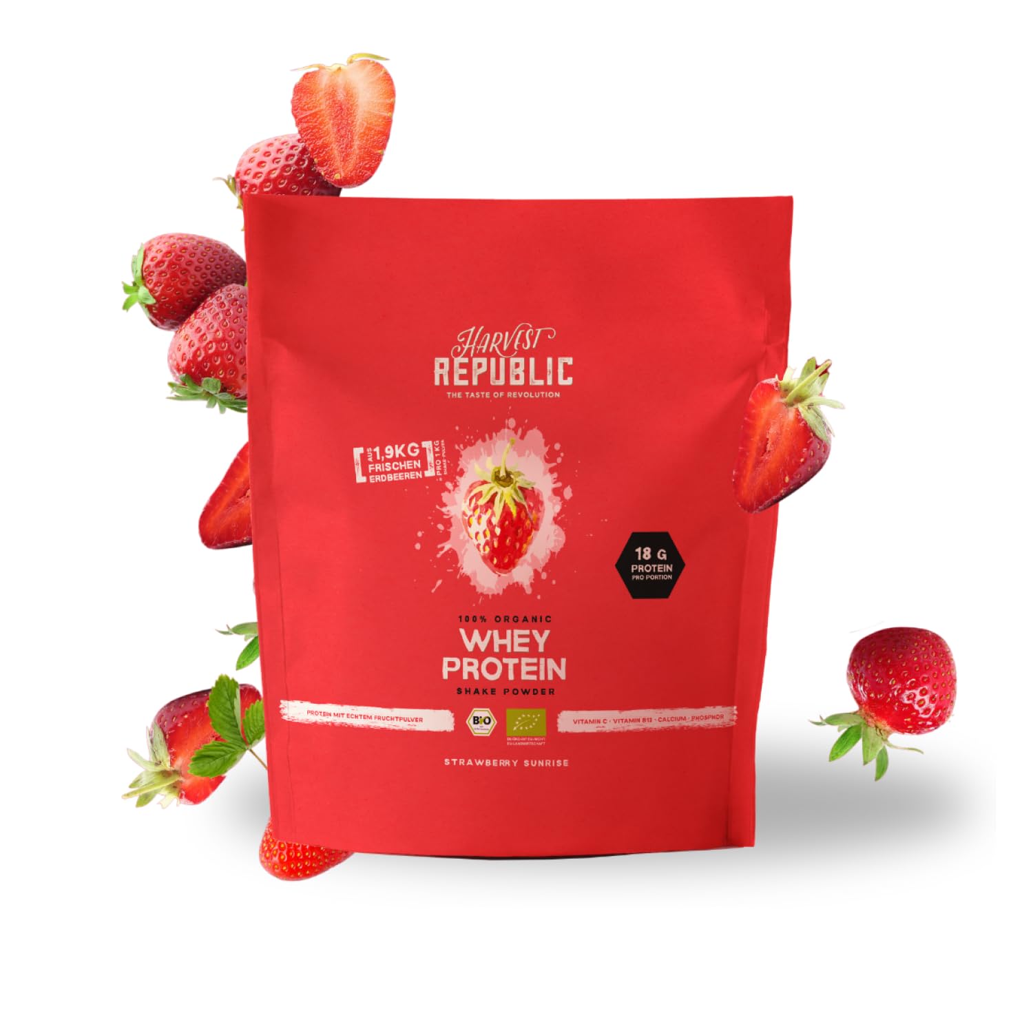 Discover a healthy, protein-rich diet with our organic protein powder – perfect for amateur and professional athletes. Our protein powder offers real added value for nutrition-conscious individuals by optimally supplementing their natural diet with a complete amino acid profile and a high concentration of BCAAs. Whether for muscle building or weight management, our whey protein powder effectively helps you achieve your training goals. Our protein shake is quick and easy to prepare, providing you with high-quality protein and essential nutrients in under a minute. With fresh, natural flavors like vanilla, banana, and strawberry protein powder, every sip is a treat, whether enjoyed as a breakfast smoothie or a nutritious snack. Our protein blend is made from 100 pure organic ingredients, with no additives or artificial flavors. The excellent taste comes from pure organic whey protein, pure organic fruit powder, and a subtle, natural sweetness. Over 570g of fresh, organic strawberries, rich in vitamin C, ensure full power in every shake. So you get not only a super tasty whey protein product, but also a particularly valuable one that supports your fitness goals and a healthy diet. Whether you prefer organic whey protein or whey protein powder, our whey protein powder and neutral protein powder offer everything you need for your goals. And best of all: our protein powder, free from artificial sugar, helps you eat healthily and mindfully without sacrificing taste. INGREDIENTS Whey protein concentrate powder, strawberry powder (17.9 ), raw cane sugarIdeal for shakes: Because our whey protein is a 100 pure organic whey concentrate with no additives, it delivers its excellent solubility and creamy consistency best in a shaker or blender. No additives: No artificial flavors or sweeteners. Our protein powder is free of artificial colors, flavors, and preservatives. The result: Premium organic protein powder. 100 organic whey protein powder: Protein powder made from delicately concentrated organic whey. For our special whey protein, we only source whey from organic cows – from Germany and Austria. Just three ingredients: Our strawberry protein powder is made from organic whey protein, freeze-dried strawberries, and organic cane sugar. Rich in vital nutrients – For delicious and beneficial shakes. A true fruit delight: 617g of fresh, organic strawberries, rich in vitamin C. With 19.3 fruit, we use only natural fruit. No artificial flavors – just pure taste.HARVEST REPUBLIC Protéines de lactosérum bio en poudre Fraise avec 100 de poudre de fruits véritables 750 g de poudre de protéines biologiques affinées avec des fruits lyophilisés Jusqu'à 18 g Fraise 750 gDESCRIPTION DU PRODUIT DESCRIPTION DU PRODUIT Découvrez une alimentation saine et riche en protéines avec notre poudre de protéines biologiques – Parfait pour les sportifs amateurs et professionnels. Notre poudre de protéines offre une véritable valeur ajoutée aux personnes soucieuses de leur nutrition en complétant de manière optimale leur alimentation naturelle avec un profil complet d'acides aminés et une forte concentration de BCAA. Que ce soit pour le développement musculaire ou la gestion du poids, notre poudre de protéines de lactosérum vous aide efficacement à atteindre votre objectif d'entraînement. Notre shake protéiné est préparé rapidement et facilement et vous fournit en moins d'une minute des protéines de qualité supérieure et des substances vitales essentielles. Avec des saveurs naturelles et fraîches telles que la vanille, la banane et la poudre protéinée de fraise, chaque gorgée devient un régal, que ce soit comme smoothie pour le petit-déjeuner ou comme collation nutritive. Notre mélange de protéines est composé à 100 d'ingrédients biologiques purs, sans additifs ni arômes. L'excellent goût provient de protéines de lactosérum biologiques pures, de poudre de fruits bio purs et d'une douceur subtile et naturelle. Plus de 570 g de fraises biologiques fraîches, riches en vitamine C, assurent une pleine puissance à chaque shake. Ainsi, vous obtenez non seulement un produit à base de protéines de lactosérum super savoureux, mais aussi particulièrement précieux qui soutient vos objectifs de fitness et une alimentation saine. Qu'il s'agisse de protéines de lactosérum bio ou de protéines de lactosérum en poudre, notre poudre de protéines de lactosérum et de protéines neutres offre tout ce dont vous avez besoin pour vos objectifs. Et le meilleur : notre poudre de protéines sans sucre artificiel vous aide à manger sainement et consciemment sans renoncer au goût. INGRÉDIENTS Poudre concentrée de protéines de lactosérum, poudre de fraise (17,9 ), sucre de canne brutIdéal pour les shakes : étant donné que notre protéine de lactosérum est un concentré de lactosérum biologique 100 pur sans additifs, elle déploie son excellente solubilité et sa consistance crémeuse au mieux dans un shaker ou un mélangeur. Sans additifs : sans arômes chimiques ni édulcorants. Notre poudre de protéines est exempte de colorants, de saveurs et de conservateurs artificiels. Le résultat : poudre de protéines biologiques de qualité supérieure. Poudre de protéines de lactosérum 100 bio : poudre de protéines obtenue à partir de lactosérum bio délicatement concentré. Pour notre protéine de lactosérum spéciale, nous n'achetons que du lactosérum provenant de vaches biologiques – d'Allemagne et d'Autriche. Seulement trois ingrédients : notre poudre protéinée fraise est composée de protéines de lactosérum bio, de fraises lyophilisées et de sucre de canne biologique. Riche en substances vitales - Pour des shakes délicieux et précieux. Véritable plaisir de fruits : 617 g de fraises biologiques fraîches, riches en vitamine C. Avec 19,3 de fruits, nous utilisons exclusivement des fruits naturels. Pas d'arômes artificiels - Seulement un goût pur.