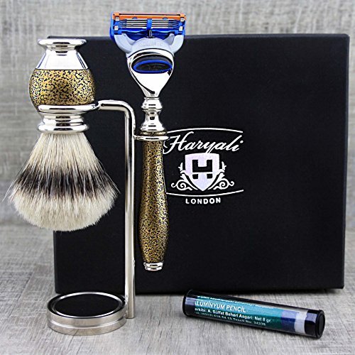 Customer satisfaction: Haryali-London will grant 100 free replacement or full money refund if the customer is not satisfied with the purchase.The shaving stand keeps brushes and razors secure and extends the lifespan of the brush by properly drying the roof hair on the brush.Alaum pencil is a crystal -like stone that is gently rubbed over the shave area to fight razorburger, razorbing and redness.The shaving brush is made of silver roof hair and you cannot carry out perfect and clean shaving without a shaving brush.Some people use their hands to make foam, but their hands cannot reach where the bristles can reach on the brush.The grip of our 5-cut razor plane is made of high-quality aluminum, which makes it more durable.Our men's razor is suitable for people with thick, rough or even curly hair.It is currently working on ingrown hair, beard and mustache and gives a smooth shave.Our manual shaving set for men comes with a razor, shaving brush, shaving rack and alum pencil.Is delivered in a nice black box and can be a perfect gift for your son, father, friends and family members for your birthday, thanks or Christmas.Kundenzufriedenheit: Haryali-London wird 100 kostenlosen Ersatz oder volle Geld-zurück-Erstattung gewähren, wenn der Kunde mit dem Kauf nicht zufrieden ist. Der Rasierständer hält Pinsel und Rasierer sicher und verlängert die Lebensdauer des Pinsels, indem er die Dachshaare auf dem Pinsel richtig trocknet. Alaumbleistift ist ein kristallähnlicher Stein, der sanft über den Rasurbereich gerieben wird, um gegen Rasieranbrüche, Rasurbelungen und Rötungen zu kämpfen. Der Rasierpinsel besteht aus silbernen Dachshaaren und Sie können keine perfekte und saubere Rasur ohne einen Rasierpinsel durchführen. Manche Menschen verwenden ihre Hände, um Schaum zu machen, aber die Hände können dort nicht erreichen, wo die Borsten auf der Bürste erreichen können. Der Griff unseres 5-schneidigen Rasierhobels besteht aus hochwertigem Aluminium, was ihn langlebiger macht. Unser Herrenrasierer ist geeignet für Menschen mit dickem, grobem oder sogar lockigem Haar. Es funktioniert gerade auf eingewachsenen Haaren, Bart und Schnurrbart und gibt eine glatte Rasur. Unser manuelles Rasierset für Männer kommt mit 5 Rasiermesser, Rasierpinsel, Rasierständer und Alaunbleistift. Wird in einer schönen schwarzen Box geliefert und kann ein perfektes Geschenk für Ihren Sohn, Vater, Freunde und Familienmitglieder zum Geburtstag, Danksagung oder Weihnachten sein.Haryali London Rasiermesser, 5-kantig, Dachshaarpinsel, Ständer und Alaun-Rasierer