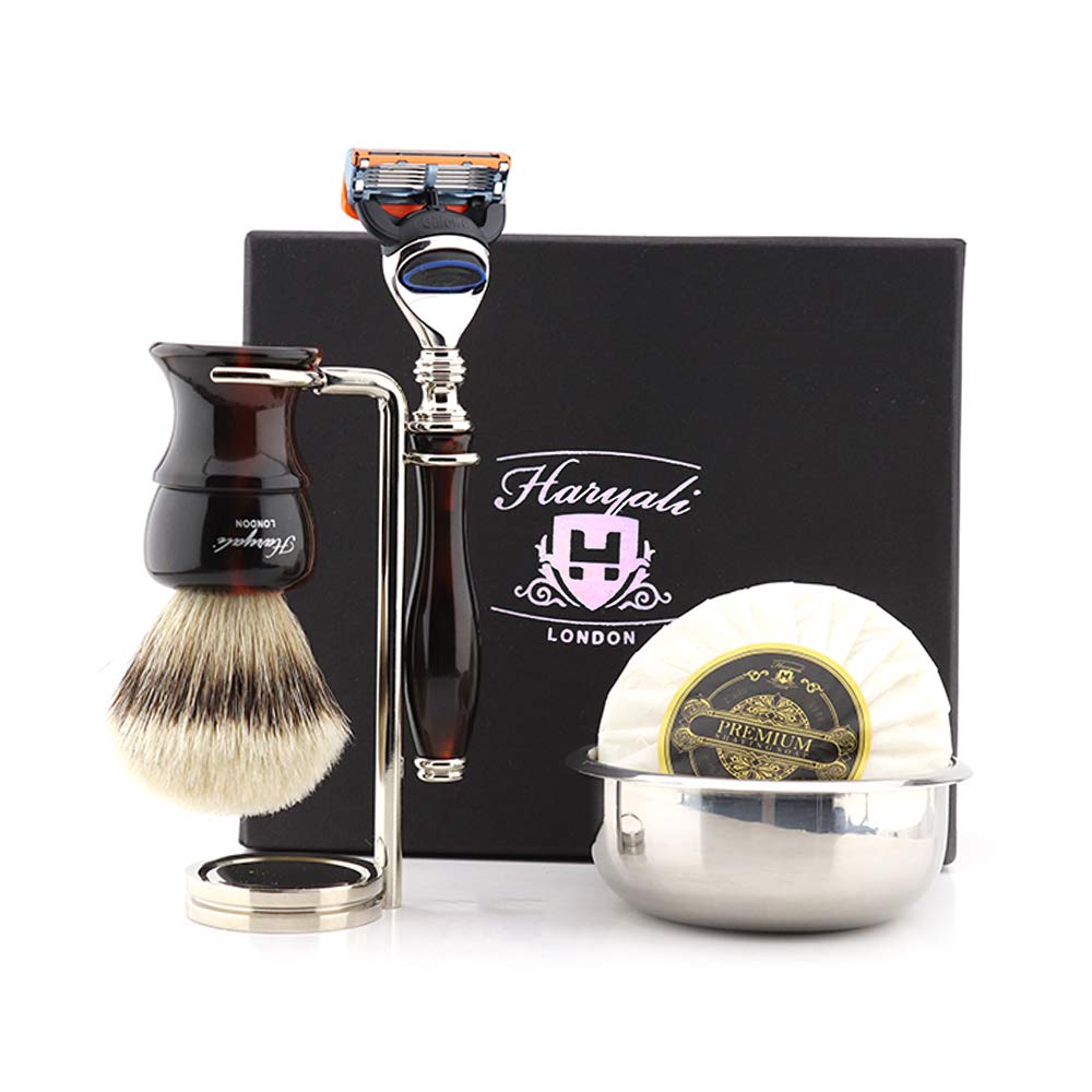 Description: 5-edge Razor: Razor with 5 Edge Cartridge for a Perfect Shave Like Hairdressing Or Salon Razor, Unique and Beautiful Design, Comfortable to Use, Long Service Life.Handle is made of resin with a beautiful design.IT Works Smoothly on Ingrown Hair, Beard, Mustache and Gives a Smooth Shave.Razor is ideal for all body hair and easy shaving.Not Comparable to Plastic Razors, High Quality Professional Razors.The Enemy of Wet Shaving Has Slipery Hands, Because IF You Use A Safety Razor, your Slipery Hand Will Cause Injury.Shaving Brush: with a Brush, you can get the right foam consistency much Easier and Faster.A Perfect and Clean Shave Cannot Be Done Without a Shaving Brush.The Brush is Made of Silver Badger Hair.Shaving Brush Plays on Important Role in Daily Shaving.The Leather Will the Hair on your face and the razor will glide over the hair and cut it much Easier.Razor Stand: Razor Stand is Made of High Quality Stainless Steel with Straight Design.The stand Holds Brushes and Razors Securely and Extends the Life of the Brush by Properly Drying The Badger Hair on the Brush.Shaving soap: Shaving soap is a hard soap that is Beaten into foam with the help of a shaving brush.Soap forms a Rich Lather to Soften the Beard Before Shaving and Provide a Creamy Base.Shaving bowl: Shaving bowl is made of high quality stainless steel with chrome plated finish.It is used to make foam in it.Some people use use their hands to make a lather and waste their shaving soap or shaving cream.Comes in a Beautiful Black Gift Box and Can Be a Perfect Gift for Your Son, Father, Husband and Friends for Birthday, Thank you, New Year or Christmas.customer satisfaction: Haryali London gives 100 free replacement or full money-back refund if the customer is not satisfied with the purchase.Razor shell is made of high -quality stainless steel with a chrome -plated surface.Shaving soap is a hard soap that is foamed with the help of a shaving brush.Offers protection and lubrication of the razor.The shaving brush is made of silver roof hair and you cannot carry out perfect and clean shaving without a shaving brush.The shaving stand keeps the razor and brush secure and extends the lifespan of the brush by properly drying the roof hair on the brush.The grip of our razor with 5 blades is made of high -quality synthetic resin with a nice design.Our men's razors are currently working on ingrown hair, beard, mustache and ensure a smooth shave.Ideally suited for people with thick, coarse or even curly hair.Our manual shaving set for men comes with a razor, shaving brush, shaving stand, shaving bowl and shaving soap.Is delivered in a beautiful black designer gift box and can be a perfect gift for your son, father, husband and friends for her birthday, thank you, New Year or Christmas.Description: 5-edge razor: Razor with 5 edge cartridge for a perfect shave like hairdressing or salon razor, unique and beautiful design, comfortable to use, long service life. Handle is made of resin with a beautiful design. It works smoothly on ingrown hair, beard, moustache and gives a smooth shave. Razor is ideal for all body hair and easy shaving. Not comparable to plastic razors, high quality professional razors. The enemy of wet shaving has slippery hands, because if you use a safety razor, your slippery hand will cause injury. Shaving Brush: With a brush, you can get the right foam consistency much easier and faster. A perfect and clean shave cannot be done without a shaving brush. The brush is made of silver badger hair. Shaving brush plays an important role in daily shaving. The leather will soften the hair on your face and the razor will glide over the hair and cut it much easier. Razor Stand: Razor stand is made of high quality stainless steel with straight design. The stand holds brushes and razors securely and extends the life of the brush by properly drying the badger hair on the brush. Shaving soap: Shaving soap is a hard soap that is beaten into foam with the help of a shaving brush. Soap forms a rich lather to soften the beard before shaving and provide a creamy base. Shaving bowl: Shaving bowl is made of high quality stainless steel with chrome plated finish. It is used to make foam in it. Some people use their hands to make a lather and waste their shaving soap or shaving cream. Comes in a beautiful black gift box and can be a perfect gift for your son, father, husband and friends for birthday, thank you, New Year or Christmas.Kundenzufriedenheit: HARYALI LONDON gibt 100 kostenlosen Ersatz oder volle Geld-zurück-Erstattung, wenn der Kunde mit dem Kauf nicht zufrieden ist. Rasierschale besteht aus hochwertigem Edelstahl mit verchromter Oberfläche. Rasierseife ist eine harte Seife, die mit Hilfe eines Rasierpinsels in Schaum geschlagen wird. Bietet Schutz und Schmierung des Rasierers. Der Rasierpinsel besteht aus silbernen Dachshaaren und Sie können keine perfekte und saubere Rasur ohne einen Rasierpinsel durchführen. Der Rasierständer hält Rasierer und Pinsel sicher und verlängert die Lebensdauer des Pinsels, indem er die Dachshaare auf dem Pinsel richtig trocknet. Der Griff unseres Rasiermessers mit 5 Klingen besteht aus hochwertigem Kunstharz mit schönem Design. Unsere Herrenrasierer arbeiten gerade auf eingewachsenem Haar, Bart, Schnurrbart und sorgen für eine glatte Rasur. Bestens geeignet für Menschen mit dickem, grobem oder sogar lockigem Haar. Unser manuelles Rasierset für Männer kommt mit 5 Rasiermesser, Rasierpinsel, Rasierständer, Rasierschale und Rasierseife. Wird in einer schönen schwarzen Designer-Geschenkbox geliefert und kann ein perfektes Geschenk für Ihren Sohn, Vater, Ehemann und Freunde zum Geburtstag, Danksagung, Neujahr oder Weihnachten sein.