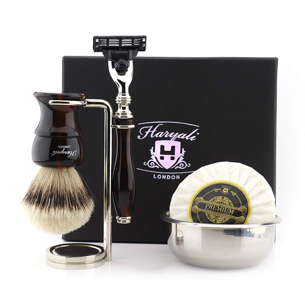Description: 3-edge Razor: Razor with 3 Edge Cartridge for a Perfect Shave Like Hairdressing Or Salon Razor, Unique and Beautiful Design, Comfortable to Use, Long Service Life.Handle is made of resin with a beautiful design.IT Works Smoothly on Ingrown Hair, Beard, Mustache and Gives a Smooth Shave.Razor is ideal for all body hair and easy shaving.Not Comparable to Plastic Razors, High Quality Professional Razors.The Enemy of Wet Shaving Has Slipery Hands, Because IF You Use A Safety Razor, your Slipery Hand Will Cause Injury.Shaving Brush: with a Brush, you can get the right foam consistency much Easier and Faster.A Perfect and Clean Shave Cannot Be Done Without a Shaving Brush.The Brush is Made of Silver Badger Hair.Shaving Brush Plays on Important Role in Daily Shaving.The Leather will make the hair on your face much Soft and the razor will glide over the hair and cut it much Easier.Razor status: Shaving stand is made of high quality stainless steel with Straight design.The stand Holds Brushes and Razor Securely and Extends the Life of the Brush by Drying the Badger Hair on the Brush Properly.Shaving soap: Shaving soap is a hard soap that is Beaten into foam with the help of a shaving brush.Soap forms a Rich Lather to Soften the Beard Before Shaving and Provide a Creamy Base.Shaving bowl: Shaving bowl is made of high quality stainless steel with a chrome-plated surface.It is used to make foam in it.Some people use use their hands to make a lather and waste their shaving soap or shaving cream.Comes in A Beautiful Black Gift Box and Can Be a Perfect Gift for Your Son, Father, Husband and Friends on Birthday, Thanks You, New Year or Christmas.customer satisfaction: Haryali London gives 100 free replacement or full money-back refund if the customer is not satisfied with the purchase.Razor shell is made of high -quality stainless steel with a chrome -plated surface.Shaving soap is a hard soap that is foamed with the help of a shaving brush.Offers protection and lubrication of the razor.The shaving brush is made of silver roof hair and you cannot carry out perfect and clean shaving without a shaving brush.The shaving stand keeps the razor and brush secure and extends the lifespan of the brush by properly drying the roof hair on the brush.The grip of our 3-cut razor consists of high-quality synthetic resin with a nice design.Our men's razors are currently working on ingrown hair, beard, mustache and ensure a smooth shave.Ideally suited for people with thick, coarse or even curly hair.Our manual shaving set for men comes with a razor, shaving brush, shaving stand, shaving bowl and shaving soap.Is delivered in a beautiful black designer gift box and can be a perfect gift for your son, father, husband and friends for her birthday, thank you, New Year or Christmas.Description: 3-edge razor: Razor with 3 edge cartridge for a perfect shave like hairdressing or salon razor, unique and beautiful design, comfortable to use, long service life. Handle is made of resin with a beautiful design. It works smoothly on ingrown hair, beard, moustache and gives a smooth shave. Razor is ideal for all body hair and easy shaving. Not comparable to plastic razors, high quality professional razors. The enemy of wet shaving has slippery hands, because if you use a safety razor, your slippery hand will cause injury. Shaving Brush: With a brush, you can get the right foam consistency much easier and faster. A perfect and clean shave cannot be done without a shaving brush. The brush is made of silver badger hair. Shaving brush plays an important role in daily shaving. The leather will make the hair on your face much softer and the razor will glide over the hair and cut it much easier. Razor Stand: Shaving stand is made of high quality stainless steel with straight design. The stand holds brushes and razor securely and extends the life of the brush by drying the badger hair on the brush properly. Shaving soap: Shaving soap is a hard soap that is beaten into foam with the help of a shaving brush. Soap forms a rich lather to soften the beard before shaving and provide a creamy base. Shaving bowl: Shaving bowl is made of high quality stainless steel with a chrome-plated surface. It is used to make foam in it. Some people use their hands to make a lather and waste their shaving soap or shaving cream. Comes in a beautiful black gift box and can be a perfect gift for your son, father, husband and friends on birthday, thank you, New Year or Christmas.Kundenzufriedenheit: HARYALI LONDON gibt 100 kostenlosen Ersatz oder volle Geld-zurück-Erstattung, wenn der Kunde mit dem Kauf nicht zufrieden ist. Rasierschale besteht aus hochwertigem Edelstahl mit verchromter Oberfläche. Rasierseife ist eine harte Seife, die mit Hilfe eines Rasierpinsels in Schaum geschlagen wird. Bietet Schutz und Schmierung des Rasierers. Der Rasierpinsel besteht aus silbernen Dachshaaren und Sie können keine perfekte und saubere Rasur ohne einen Rasierpinsel durchführen. Der Rasierständer hält Rasierer und Pinsel sicher und verlängert die Lebensdauer des Pinsels, indem er die Dachshaare auf dem Pinsel richtig trocknet. Der Griff unseres 3-schneidigen Rasierers besteht aus hochwertigem Kunstharz mit schönem Design. Unsere Herrenrasierer arbeiten gerade auf eingewachsenem Haar, Bart, Schnurrbart und sorgen für eine glatte Rasur. Bestens geeignet für Menschen mit dickem, grobem oder sogar lockigem Haar. Unser manuelles Rasierset für Männer kommt mit 3 Rasiermesser, Rasierpinsel, Rasierständer, Rasierschale und Rasierseife. Wird in einer schönen schwarzen Designer-Geschenkbox geliefert und kann ein perfektes Geschenk für Ihren Sohn, Vater, Ehemann und Freunde zum Geburtstag, Danksagung, Neujahr oder Weihnachten sein.