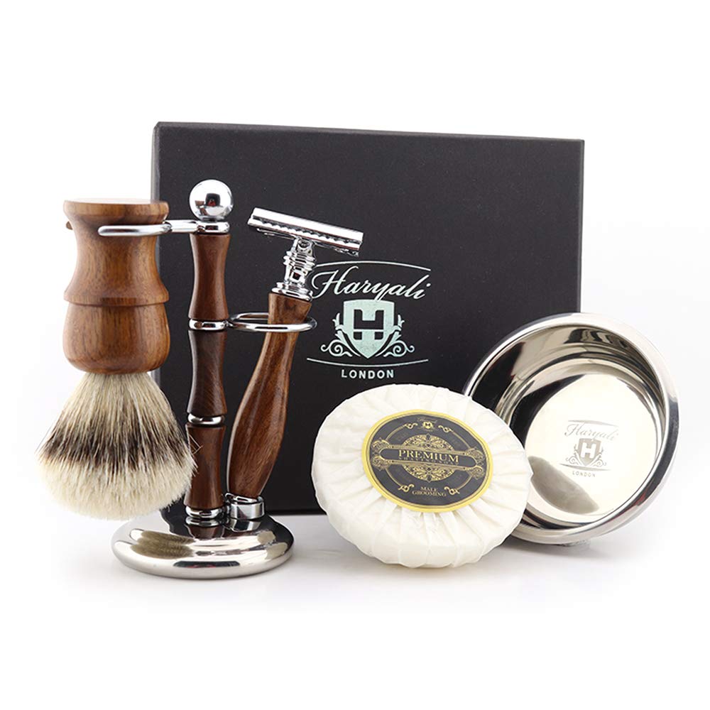 Double SIDED Safety Razor: Our Best Razor Gives You The Closest and Perfect Shave.IT Works Smoothly on Ingrown Hair, Beard, Mustache and Gives a Smooth Shave.The Handle of our Double Sided Razor Is Made of High Quality Wood and The Head Is Made of Zinc Alloy, Making It More Durable.Razor is ideal for all body hair and easy shaving.Our men's razor offer you the best Clean Shave Than Straight Razor.Suitable for all double blade razors is suitable for Both men and women.While Shaving, Keep Your Hands Dry Because IF You Use A Razor Your Slipery Hand Will Cause Injury.Shaving Brush: with a Brush, you can get the right foam consistency much Easier and Faster.The Brush is Made of Silver Badger Hair.Shaving Brush Plays on Important Role in Daily Shaving.The Leather will make the hair on your face much Sohut, and the razor will slide over the hair and cut them much Easier.Razor Stand: Shaving Stand Made of High Quality Steel Wood With Straight Finish.The stand Holds Brush and Razor Securely and Extends the Life of the Brush by Properly Drying The Badger Hair on the Brush.Shaving soap: Shaving soap is a hard soap, Whipped in foam with the help of a shaving brush.Soap forms a Rich foam to Soften the Beard Before Shaving and Provide a Creamy Base.Shaving bowl: Shaving bowl is made of high quality stainless steel with chrome plated finish.It is used to make foam in it.Some people use use their hands to make a foam and waste their shaving soap or shaving cream.Comes in a Beautiful Black Gift Box and Can Be a Perfect Gift for Your Son, Dad, Husband and Friends on Birthday, New Year's Eve Or Christmas.customer satisfaction: Haryali London gives 100 free replacement or full money-back refund if the customer is not satisfied with the purchase.Razor shell is made of high -quality stainless steel with a chrome -plated surface.Shaving soap is a hard soap that is foamed with the help of a shaving brush.Offers protection and lubrication of the razor.The shaving brush is made of silver roof hair and you cannot carry out perfect and clean shaving without a shaving brush.The shaving stand keeps the razor and brush secure and extends the lifespan of the brush by properly drying the roof hair on the brush.The grip of our double -edged razor plane is made of 100 pure wood.Our men's razors are currently working on ingrown hair, beard, mustache and ensure a smooth shave.Ideally suited for people with thick, coarse or even curly hair.Our manual shaving set for men comes with a double razor, shaving brush, shaving stand, shaving bowl and shaving soap.Is delivered in a beautiful black designer gift box and can be a perfect gift for your son, father, husband and friends for her birthday, thank you or Christmas.Double Sided Safety Razor: Our best razor gives you the closest and perfect shave. It works smoothly on ingrown hair, beard, mustache and gives a smooth shave. The handle of our double sided razor is made of high quality wood and the head is made of zinc alloy, making it more durable. Razor is ideal for all body hair and easy shaving. Our men's razor offers you the best clean shave than straight razor. Suitable for all double blade razors is suitable for both men and women. While shaving, keep your hands dry because if you use a razor your slippery hand will cause injury. Shaving Brush: With a brush, you can get the right foam consistency much easier and faster. The brush is made of silver badger hair. Shaving brush plays an important role in daily shaving. The leather will make the hair on your face much softer, and the razor will slide over the hair and cut them much easier. Razor Stand: Shaving stand made of high quality steel wood with straight finish. The stand holds brush and razor securely and extends the life of the brush by properly drying the badger hair on the brush. Shaving soap: Shaving soap is a hard soap, whipped in foam with the help of a shaving brush. Soap forms a rich foam to soften the beard before shaving and provide a creamy base. Shaving bowl: Shaving bowl is made of high quality stainless steel with chrome plated finish. It is used to make foam in it. Some people use their hands to make a foam and waste their shaving soap or shaving cream. Comes in a beautiful black gift box and can be a perfect gift for your son, dad, husband and friends on birthday, New Year's Eve or Christmas.Kundenzufriedenheit: HARYALI LONDON gibt 100 kostenlosen Ersatz oder volle Geld-zurück-Erstattung, wenn der Kunde mit dem Kauf nicht zufrieden ist. Rasierschale besteht aus hochwertigem Edelstahl mit verchromter Oberfläche. Rasierseife ist eine harte Seife, die mit Hilfe eines Rasierpinsels in Schaum geschlagen wird. Bietet Schutz und Schmierung des Rasierers. Der Rasierpinsel besteht aus silbernen Dachshaaren und Sie können keine perfekte und saubere Rasur ohne einen Rasierpinsel durchführen. Der Rasierständer hält Rasierer und Pinsel sicher und verlängert die Lebensdauer des Pinsels, indem er die Dachshaare auf dem Pinsel richtig trocknet. Der Griff unseres zweischneidigen Rasierhobels besteht aus 100 reinem Holz. Unsere Herrenrasierer arbeiten gerade auf eingewachsenem Haar, Bart, Schnurrbart und sorgen für eine glatte Rasur. Bestens geeignet für Menschen mit dickem, grobem oder sogar lockigem Haar. Unser manuelles Rasierset für Männer kommt mit doppeltem Rasiermesser, Rasierpinsel, Rasierständer, Rasierschale und Rasierseife. Wird in einer schönen schwarzen Designer-Geschenkbox geliefert und kann ein perfektes Geschenk für Ihren Sohn, Vater, Ehemann und Freunde zum Geburtstag, Danksagung oder Weihnachten sein.Haryali London Herren-Rasierset mit doppelseitigem Rasierhobel, Dachshaarpinsel, Stand, Seife und Schüssel, 5-teiliges Set